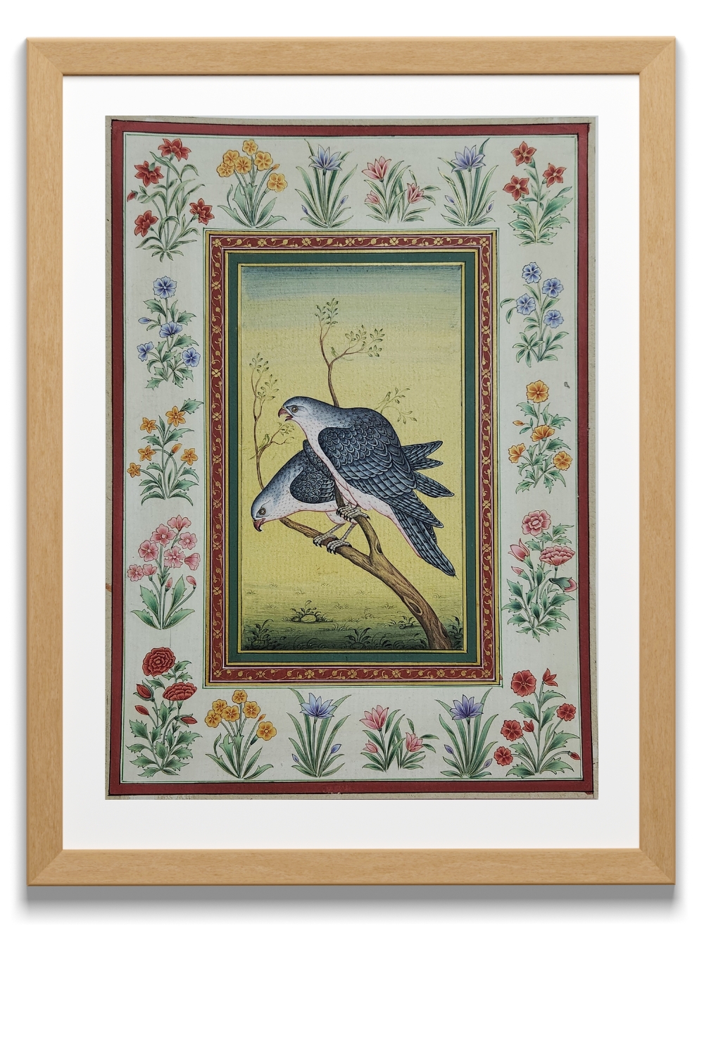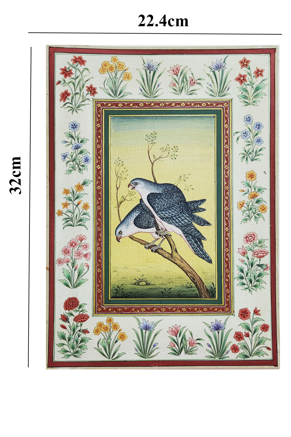 This exquisite miniature painting showcases two falcons perched on a branch, surrounded by a vibrant floral border. The painting features: