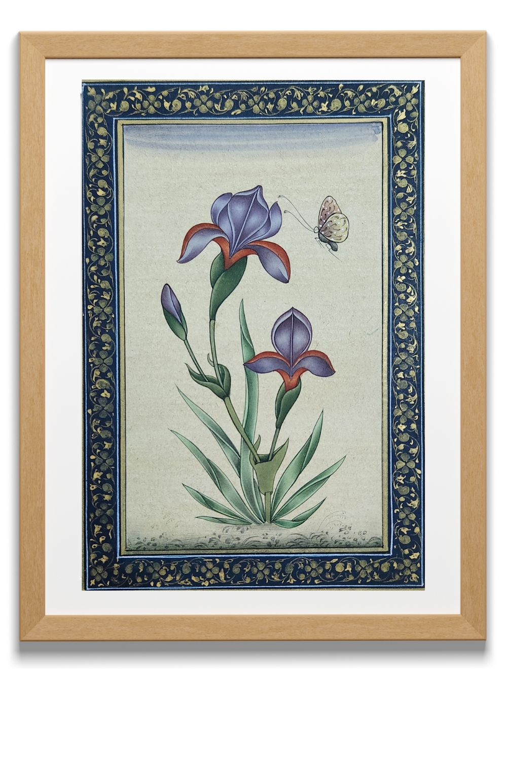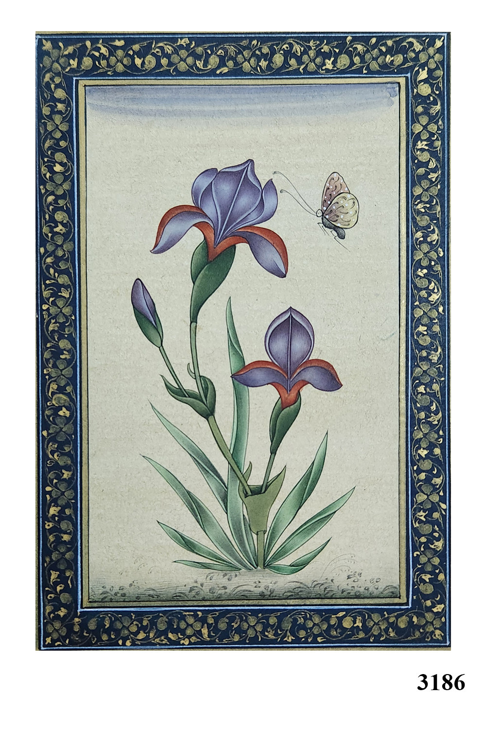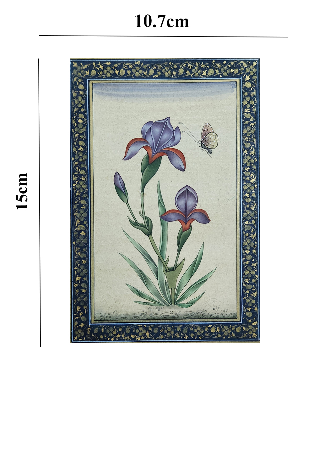This exquisite miniature painting captures the serene beauty of nature with its detailed depiction of two irises in bloom and a butterfly in flight. The artwork is framed by an intricate border of gold and blue floral patterns, enhancing its elegance. The irises are painted in shades of purple and red, with green leaves and stems, showcasing the artist's skill in botanical illustration. The butterfly, with its delicate wings, adds a sense of movement and life to the composition. The background is kept simple, allowing the vibrant colors and intricate details of the flowers and butterfly to stand out.