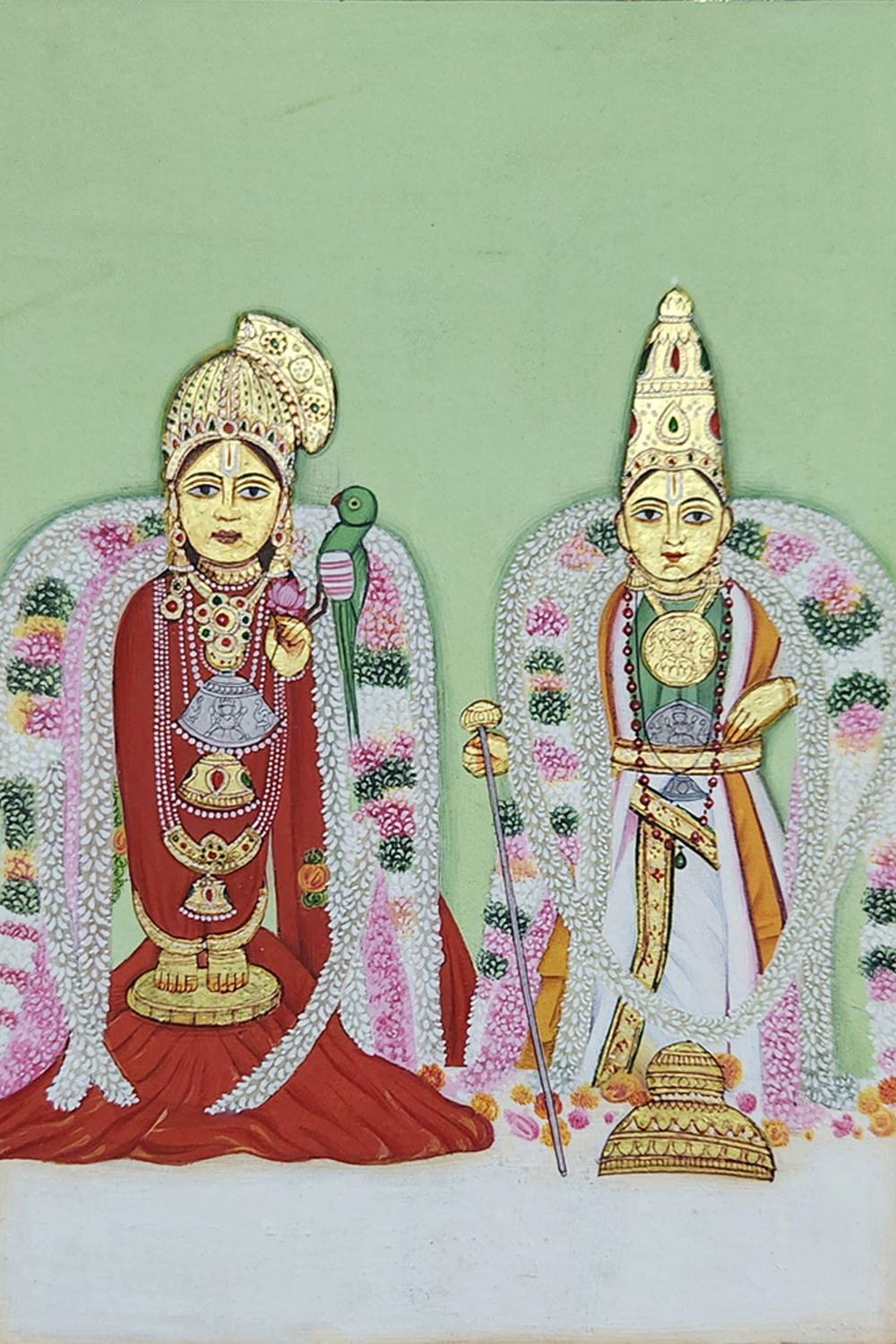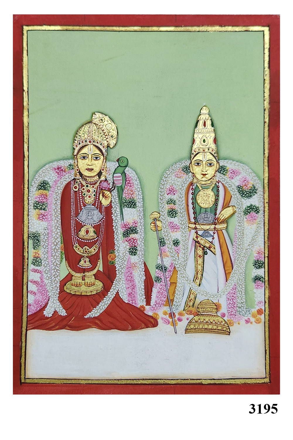 This exquisite miniature painting depicts a divine couple adorned in traditional attire and elaborate jewelry, seated against a lush green background. Intricate floral garlands drape around them, showcasing the rich cultural heritage and artistic finesse of traditional Indian miniature art. Elevate any space with this timeless piece of art, perfect for adding a touch of cultural richness and elegance to your home or office. Ideal for art enthusiasts and collectors alike, "Divine Couple" is a testament to the intricate wonders of traditional Indian art, captured through meticulous craftsmanship and artistic vision.