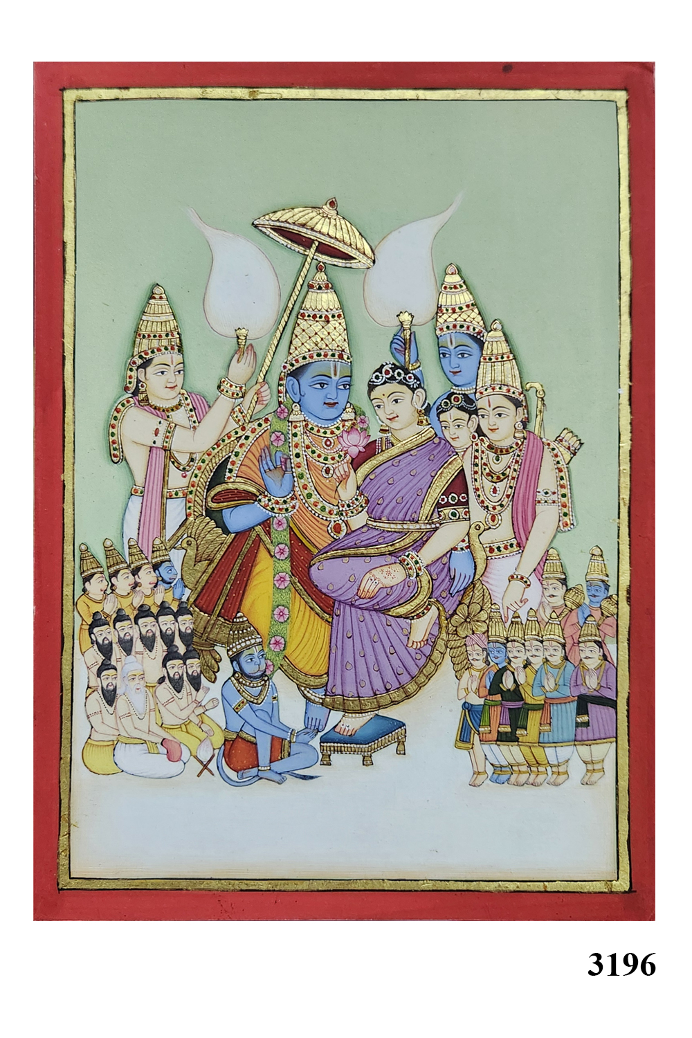 "Divine Assembly" captures the essence of a celestial gathering, showcasing intricate and vibrant artwork. The central deities, adorned in elaborate jewelry and traditional garments, are surrounded by attendants and worshippers, each figure meticulously detailed. Hand-painted using natural stone colors and gold leaf on paper, the artwork reflects the rich cultural and religious heritage of Rajasthan. The minimal background ensures that the central figures are the focal point, creating a striking contrast with the vibrant colors and gold accents.