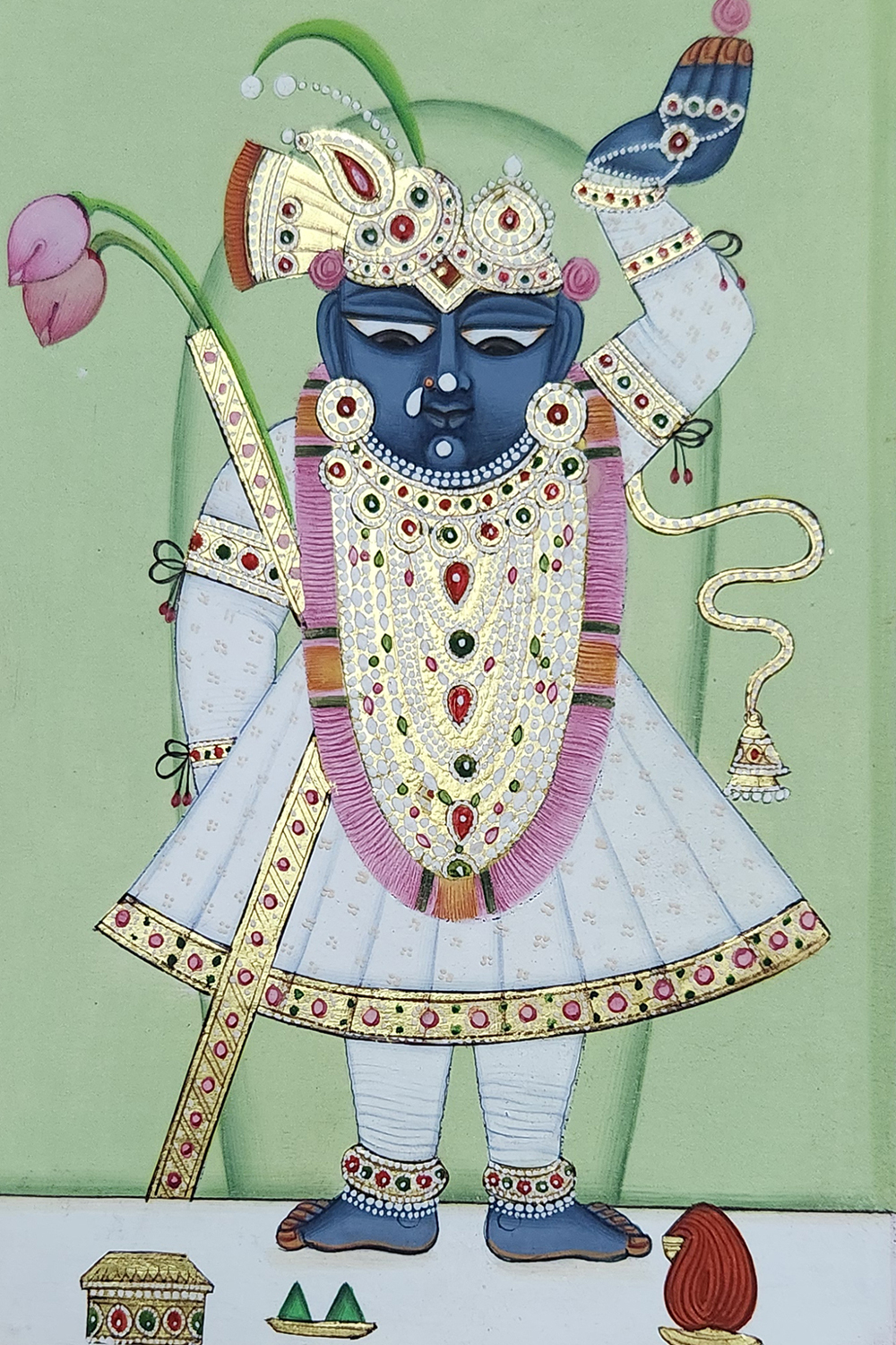 "Pichwai Painting of Shrinathji" captures the divine essence of Shrinathji, a revered deity in Hinduism. The painting features Shrinathji with a blue complexion, adorned with ornate jewelry and dressed in traditional attire. The background is a soothing green, which contrasts beautifully with the vibrant colors of the deity's attire and accessories. Intricate details such as the lotus flower, the elaborate headgear, and the decorative borders highlight the craftsmanship of traditional Pichwai art. Hand-painted using natural pigments and gold leaf on paper, the artwork reflects the rich cultural and religious heritage of Rajasthan.