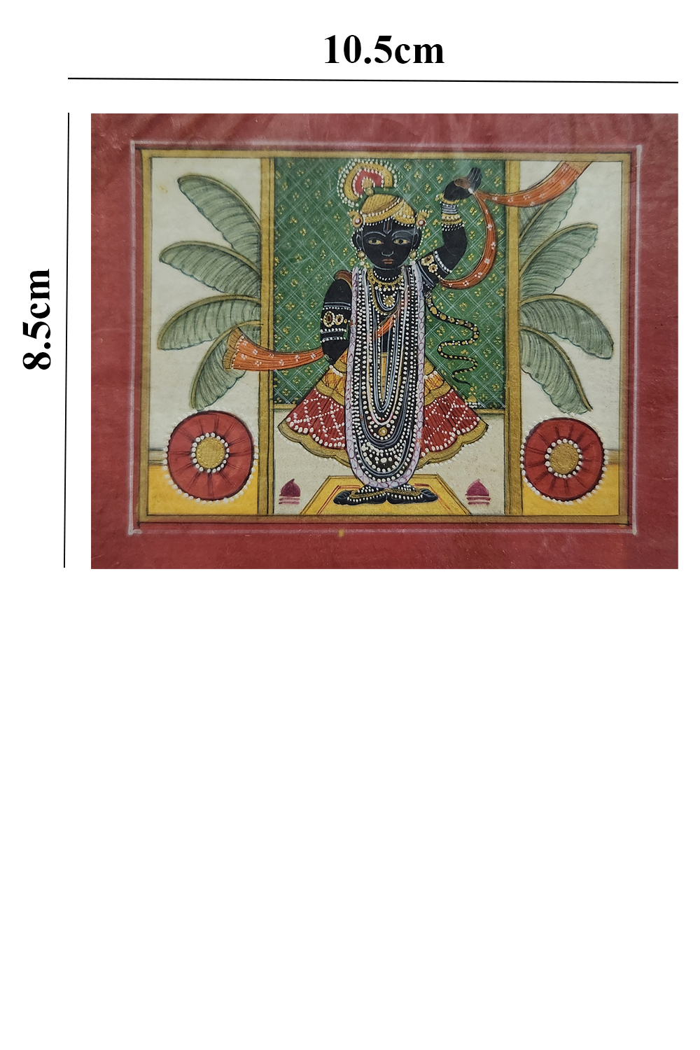 "Krishna with Flute" captures the divine essence of Lord Krishna, depicted with dark blue skin, playing a flute. The deity is adorned with elaborate jewelry and a crown, and dressed in a red and yellow garment. The background features lush green foliage and decorative elements, with two large red flowers on either side, highlighting the rich cultural and religious heritage of India. The intricate detailing and vibrant colors make this painting a captivating piece of art. Hand-painted using natural stone colors and gold leaf on handmade paper, this artwork reflects the skill and craftsmanship of traditional Indian miniature painting techniques.