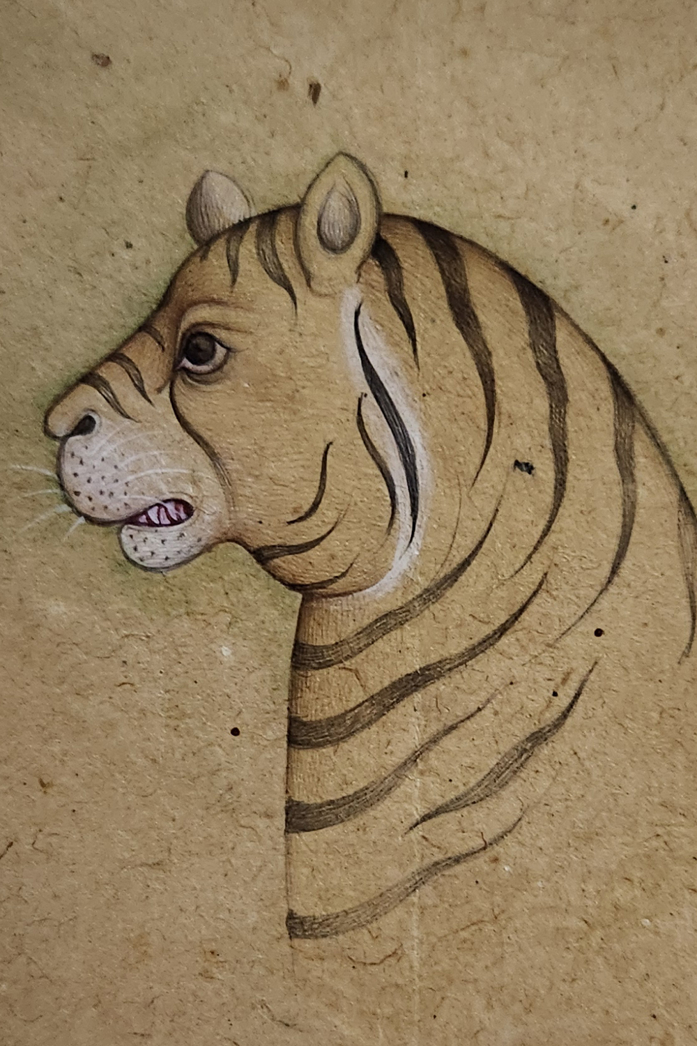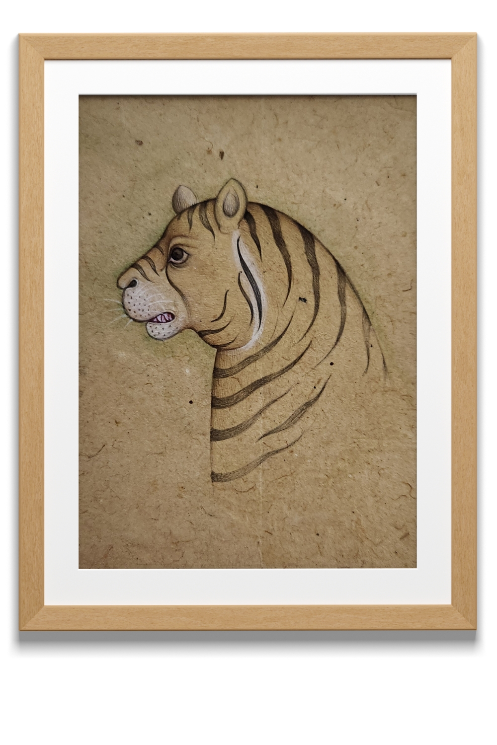 Product Content in Details: Majestic Tiger Profile showcases the regal essence of the tiger, a symbol of power and courage. The tiger is depicted in precise detail, with its distinctive stripes, sharp gaze, and strong jawline rendered meticulously. The earthy-toned background complements the subject, giving the painting an antique and traditional feel. Created using natural pigments and traditional miniature painting techniques, this artwork represents the rich artistic heritage of Rajasthan.