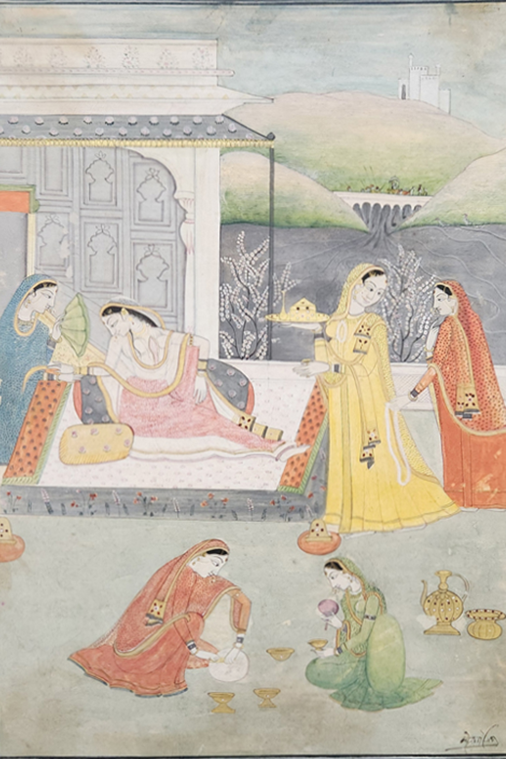 The background features ornate palace architecture and floral motifs, enhancing the grandeur of the setting without overwhelming the central figures. The artist's exceptional skill is evident in the fine brushwork and harmonious composition, which balances intricate detailing with vibrant natural pigments and gold accents.