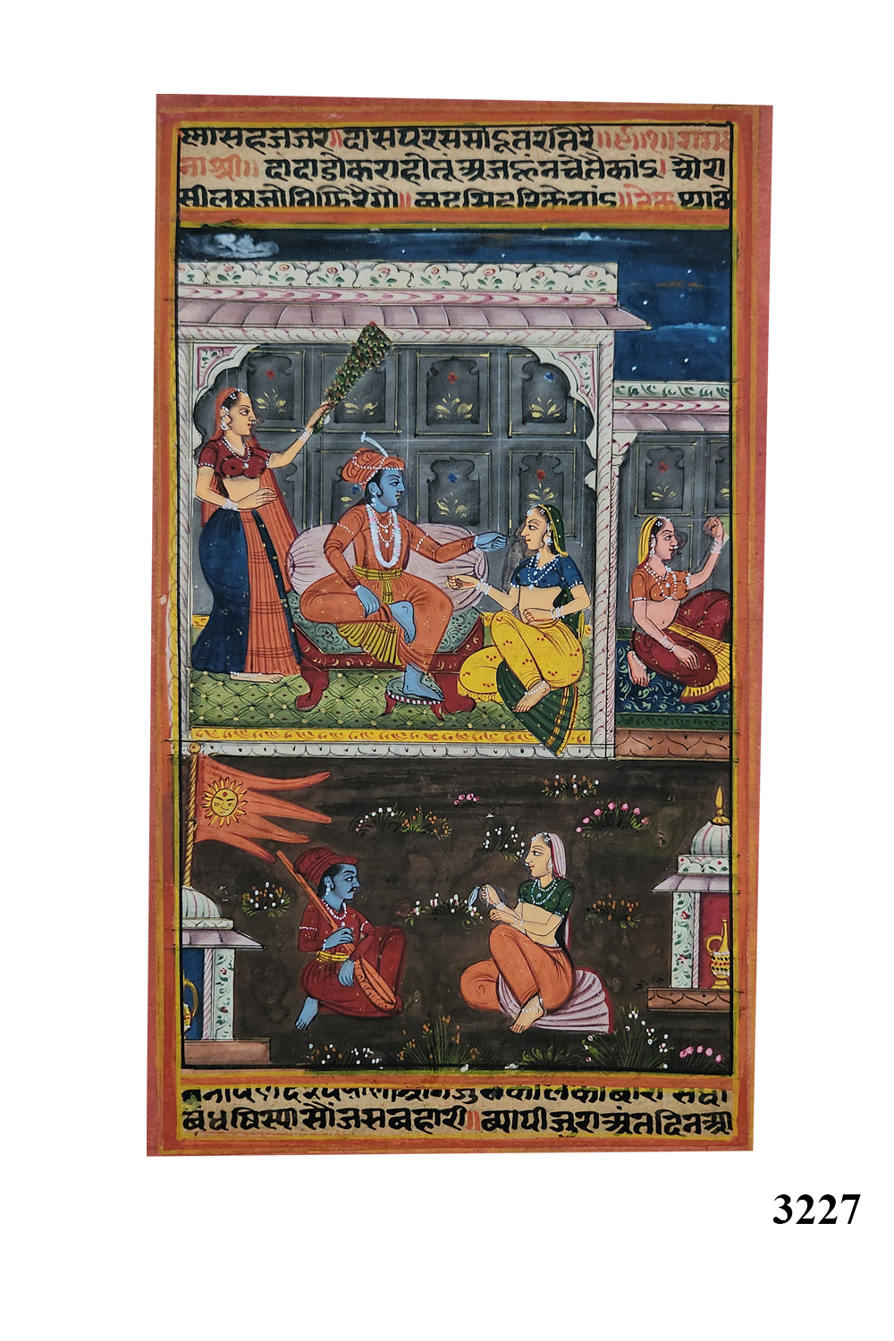 - Dual Composition: The painting beautifully integrates two distinct yet harmonious portrayals of Krishna.
