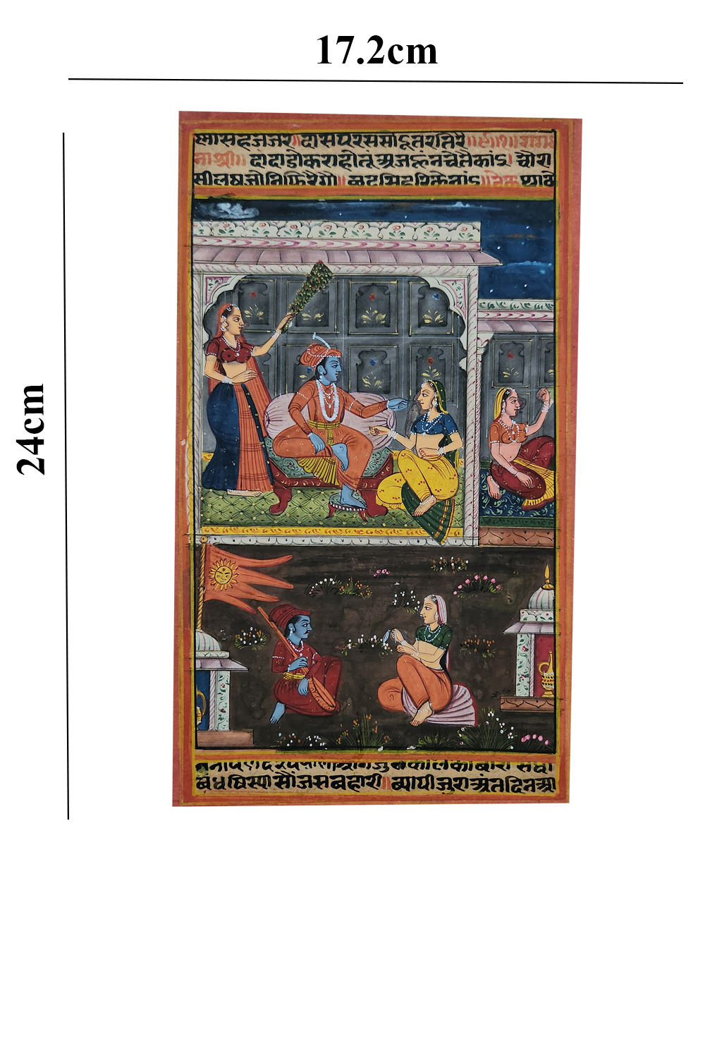 Krishna with Gopis is a meticulously crafted miniature painting that presents two enchanting moments of Lord Krishna’s divine presence. In the upper section, Krishna sits regally on a grand throne, surrounded by Gopis who honor him with gestures of devotion, one gently fanning him while others express admiration. The lower section transitions into a serene garden setting, where Krishna plays his flute, enveloped by nature’s tranquility as a devoted Gopi listens to his celestial melodies. The ornate borders, delicate brushstrokes, and traditional motifs enhance the cultural authenticity of the piece, making it an exquisite work of Indian miniature artistry. Please note that the frame shown is for visual representation only and is not included in the price.