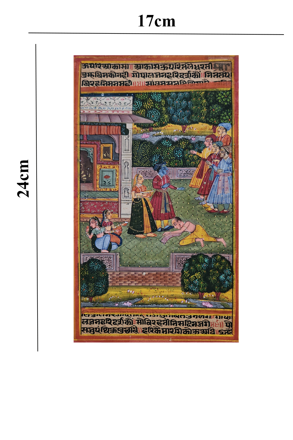 This exquisite hand-painted miniature captures the essence of Radha and Krishna’s divine love through two distinct yet harmonious portrayals. In the upper section, Krishna is seated on a grand throne, surrounded by Radha and attendants in an opulent palace setting, symbolizing admiration and devotion. The lower section transitions into a serene garden scene, where Krishna and Radha share a moment of tranquility, their expressions reflecting deep affection and connection. The painting is adorned with intricate motifs, vibrant colors, and ornate borders, reinforcing its cultural significance. The delicate brushwork, rich jewel tones, and mythological narrative make this artwork a treasured piece of Indian artistry. Please note that the frame shown is for visual representation only and is not included in the price.