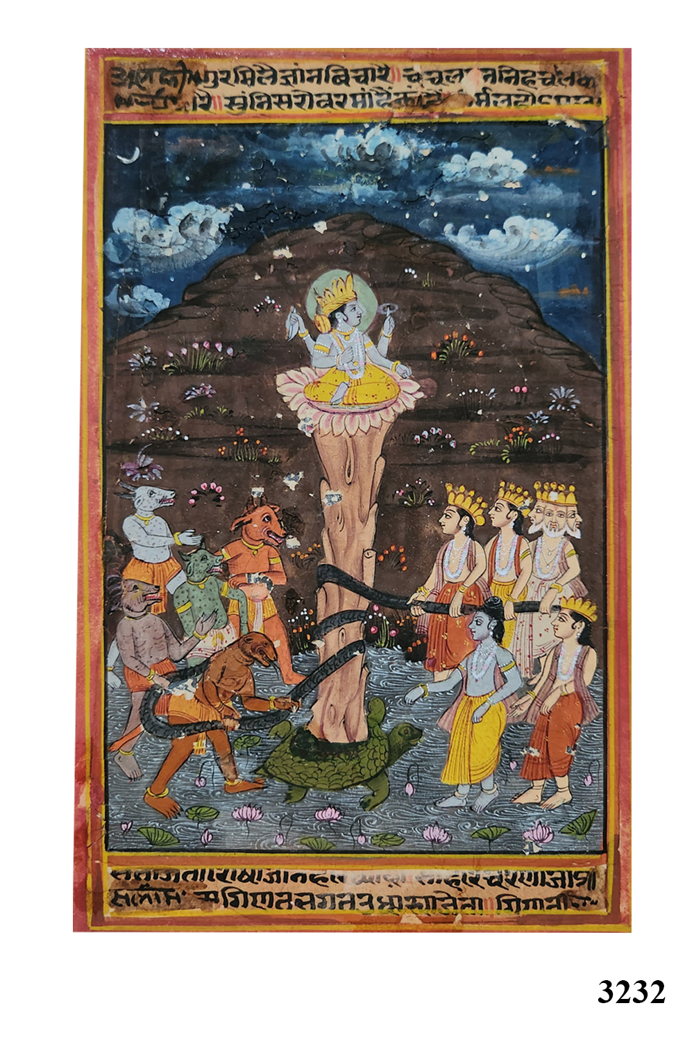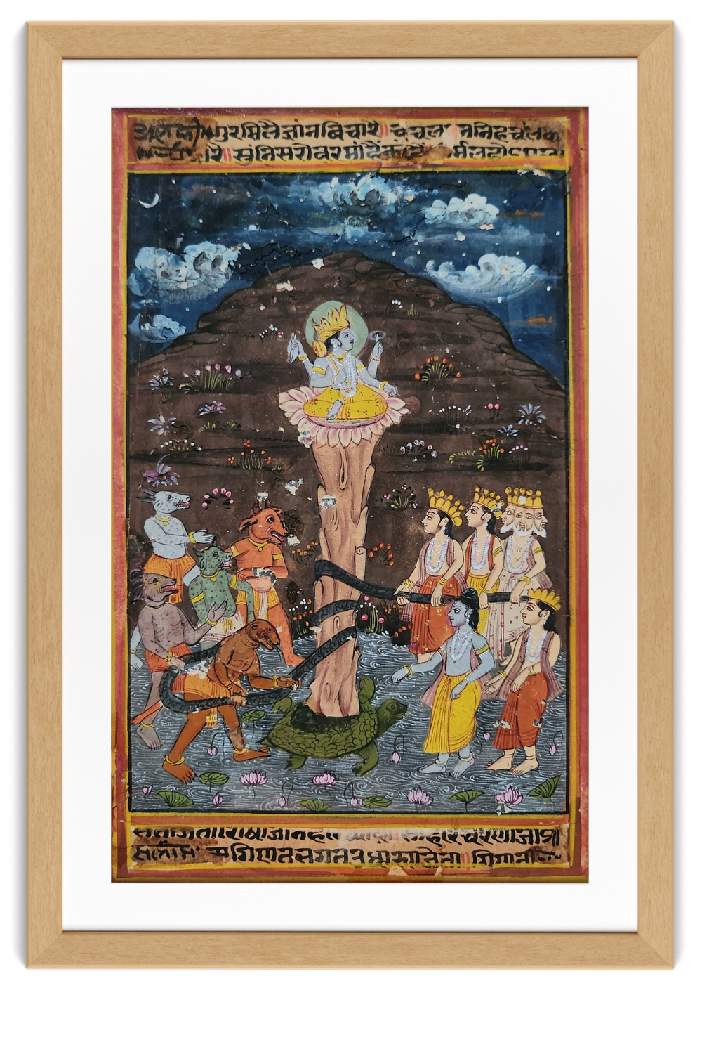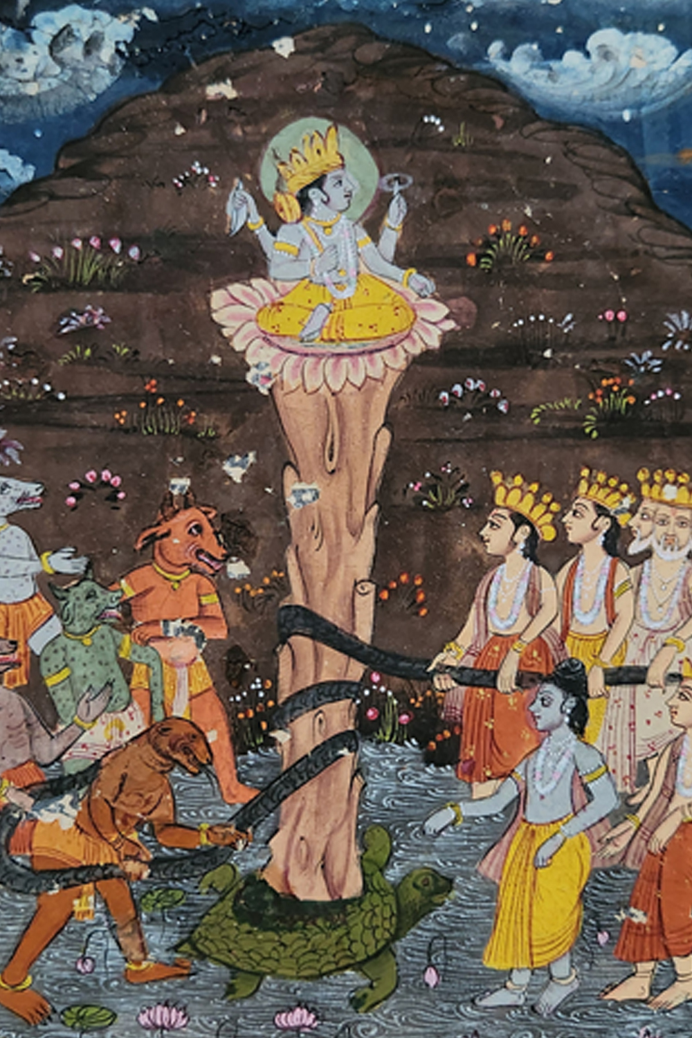 - Depicts the mythological Samudra Manthan—the cosmic churning of the ocean.