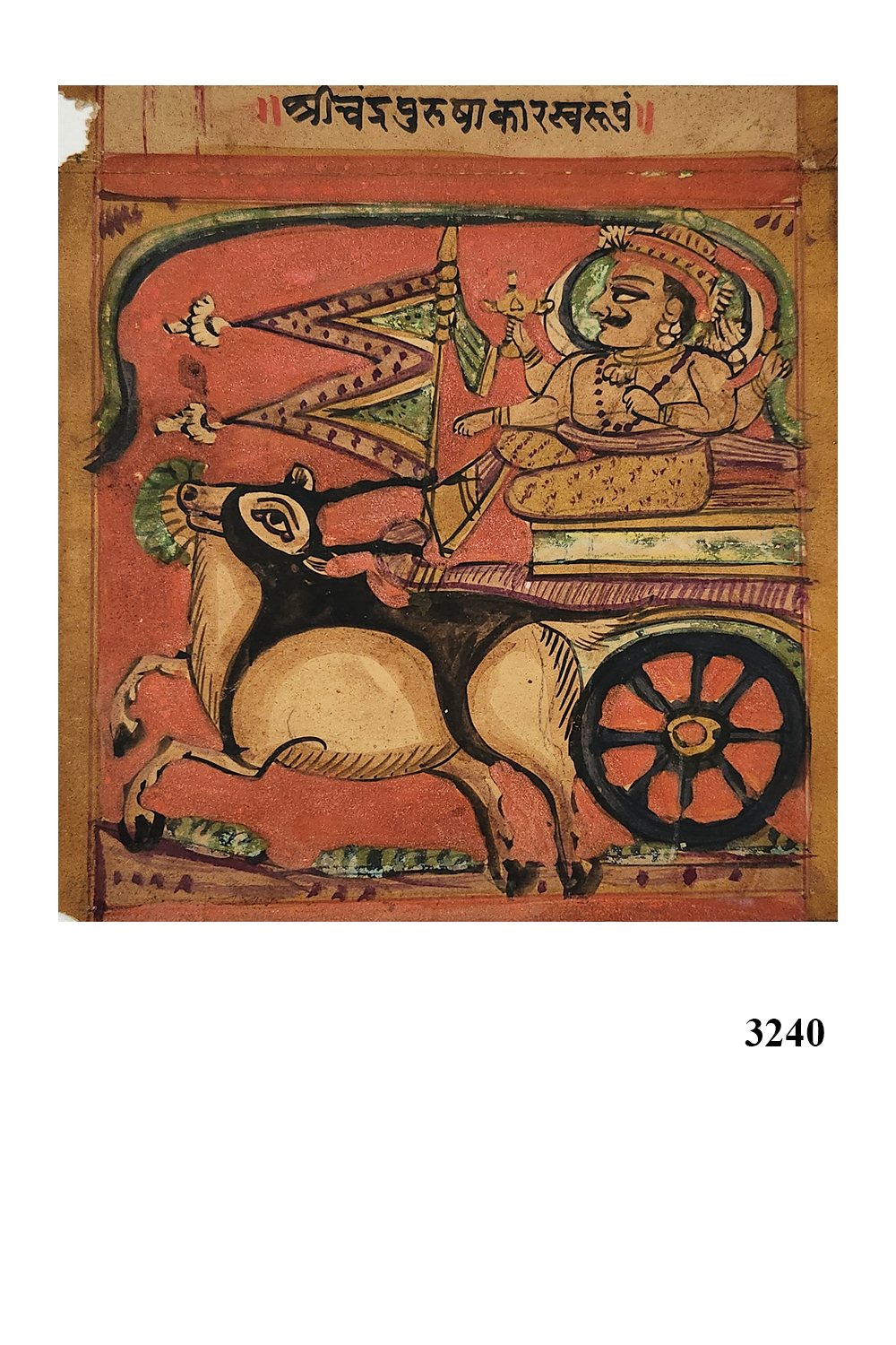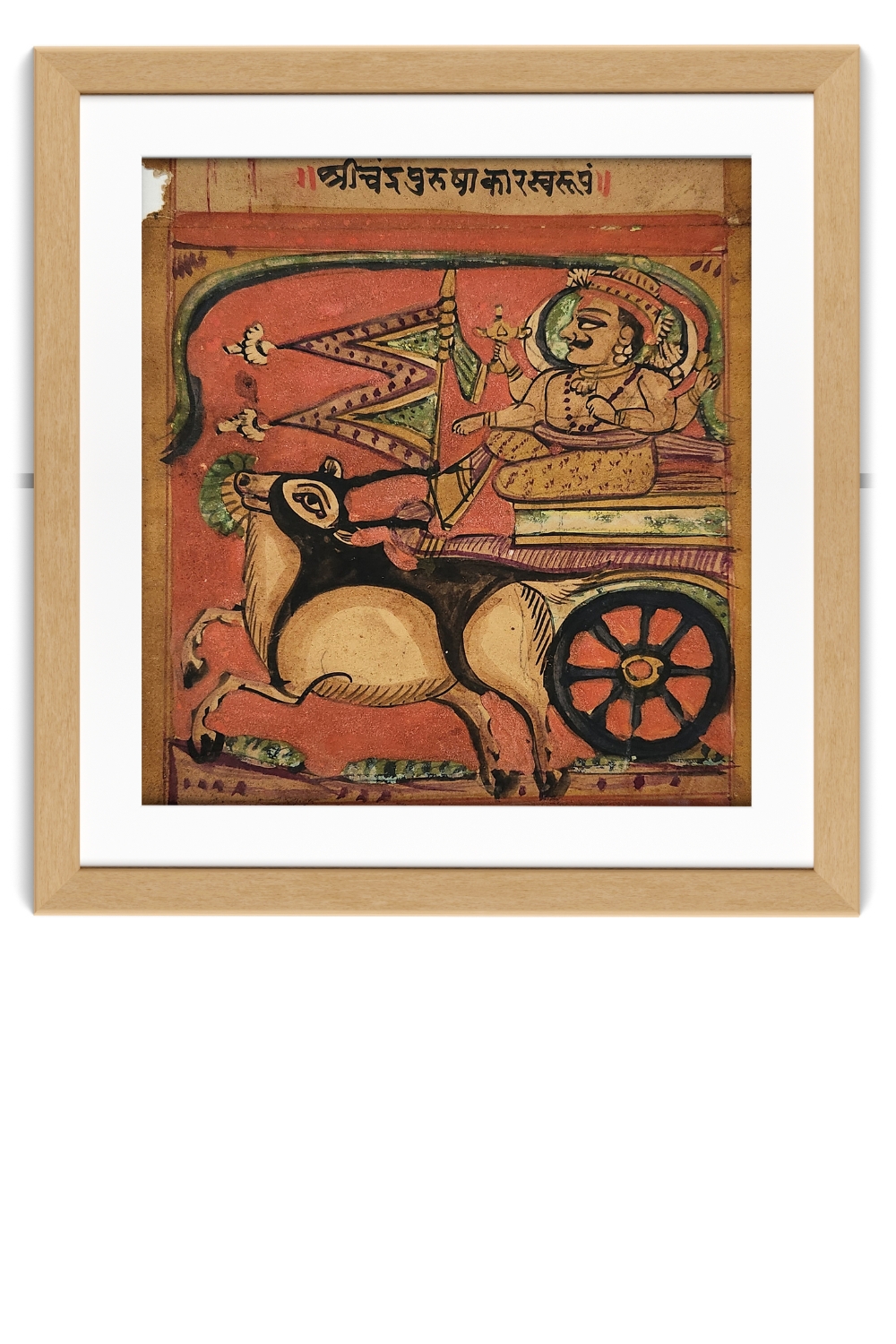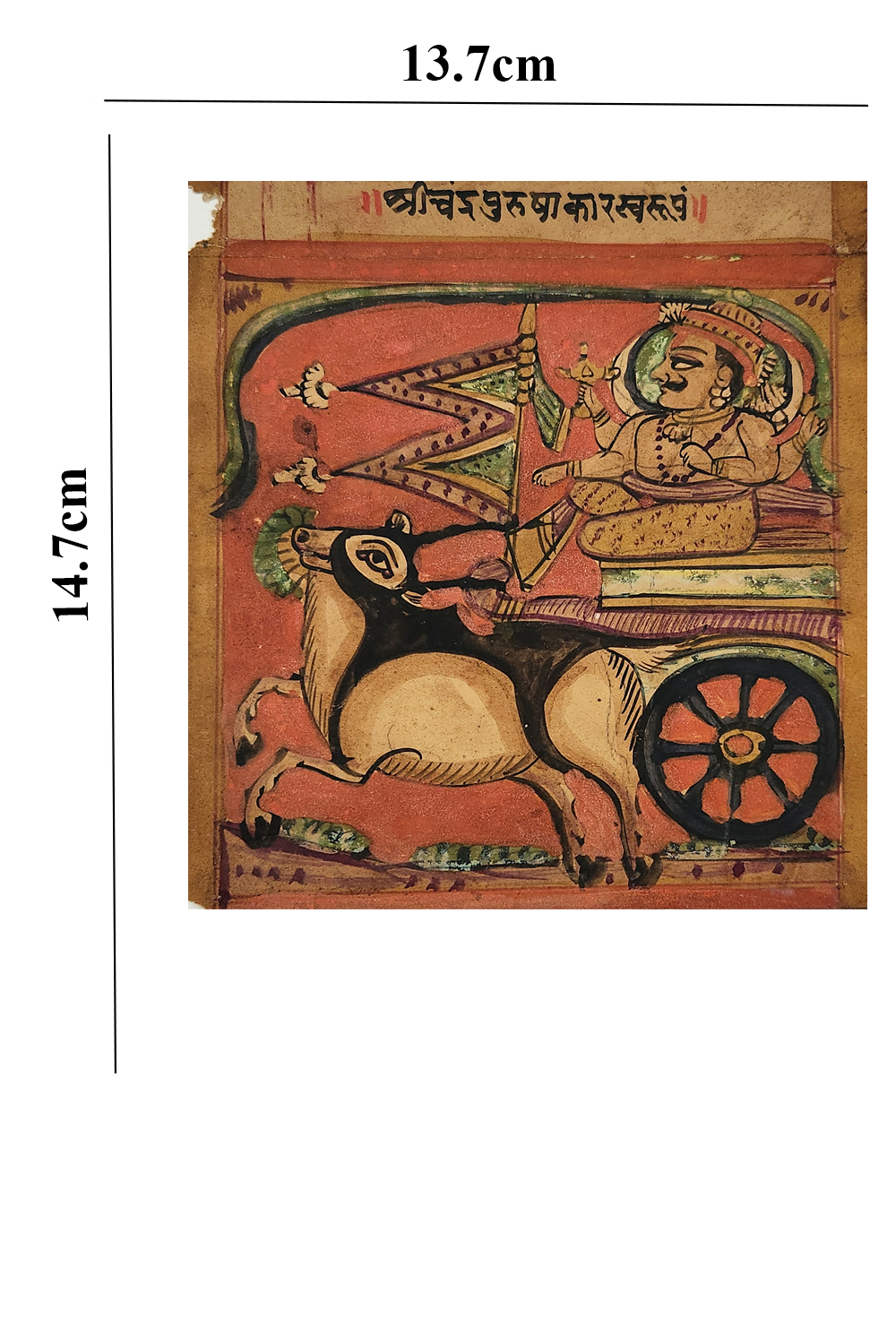 This exquisite miniature painting captures the grandeur of Lord Vishnu, seated regally on Garuda, his divine eagle mount. The artwork is a testament to traditional Indian craftsmanship, featuring intricate detailing, vibrant hues, and delicate brushwork that bring the scene to life. Lord Vishnu, adorned with ornate jewelry and a majestic crown, holds his iconic conch and mace, signifying wisdom and strength. Garuda, depicted with a human-like body and an eagle’s head, is shown in dynamic motion, pulling the chariot with unwavering devotion. The background is enriched with decorative elements, enhancing the painting’s visual appeal and cultural significance. This masterpiece is a perfect blend of mythology and artistry, making it an ideal addition to any collection celebrating Indian heritage. Please note that the frame is included for visual representation only and is not part of the purchase price.