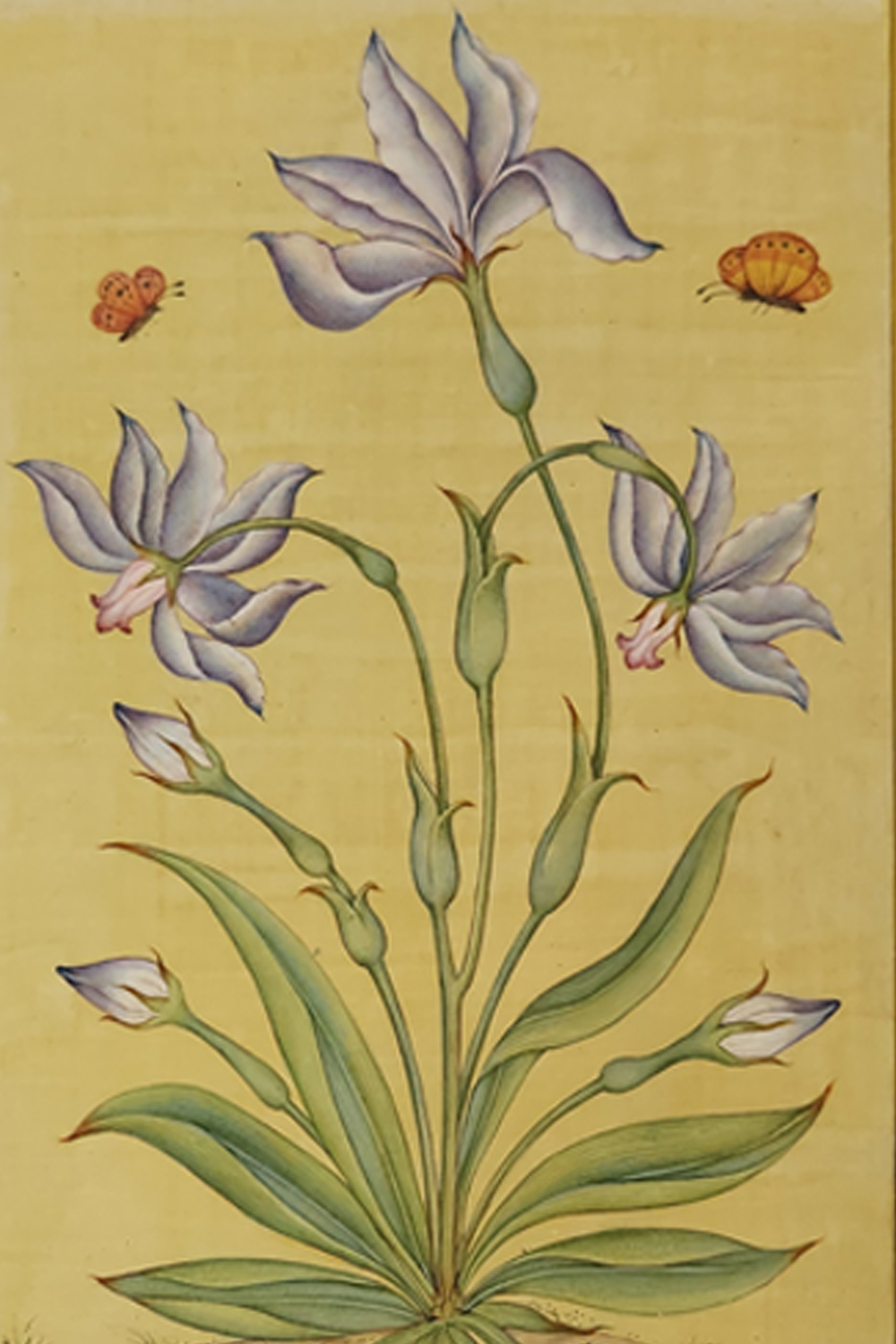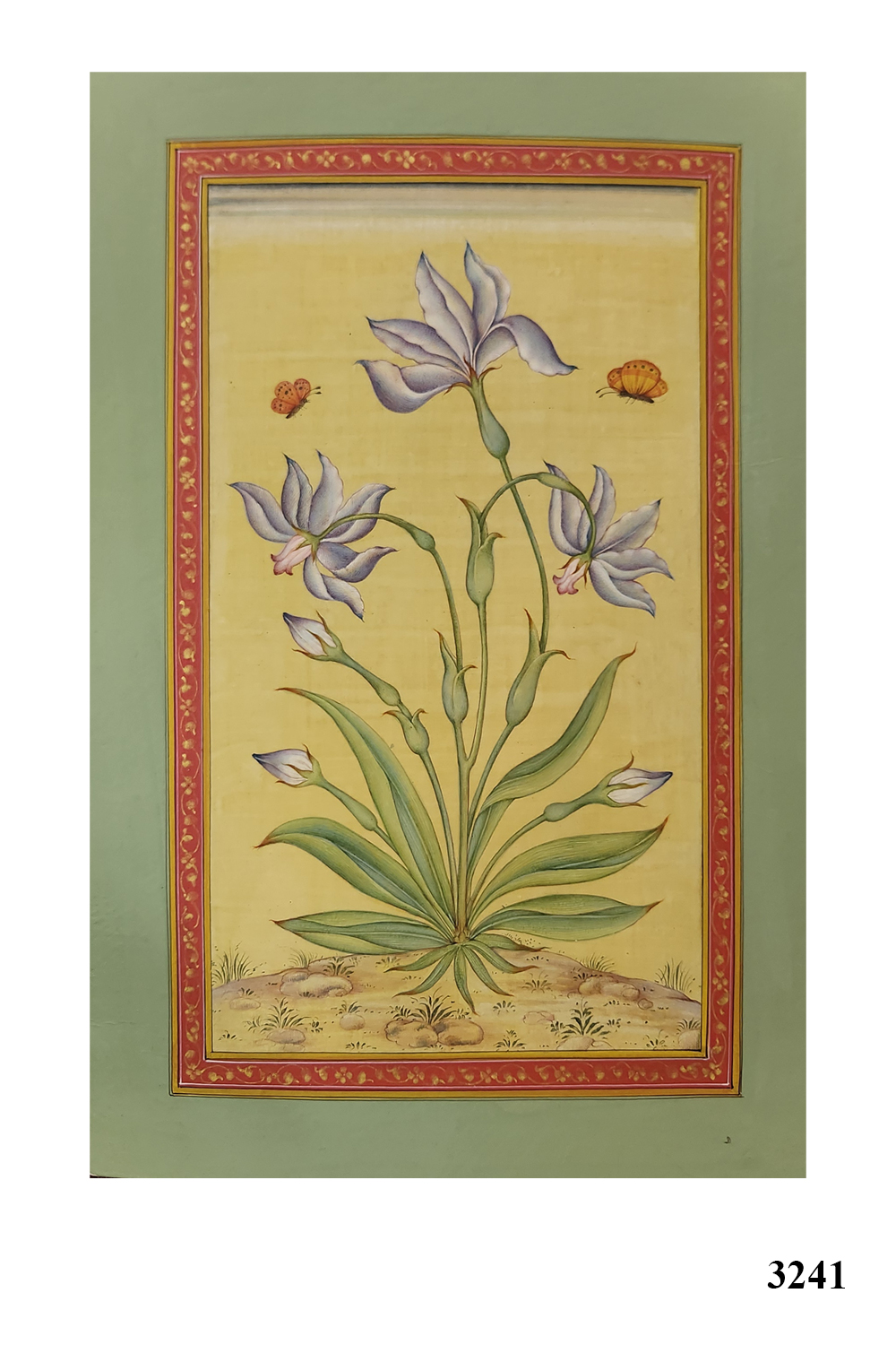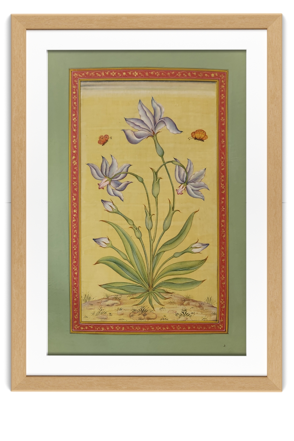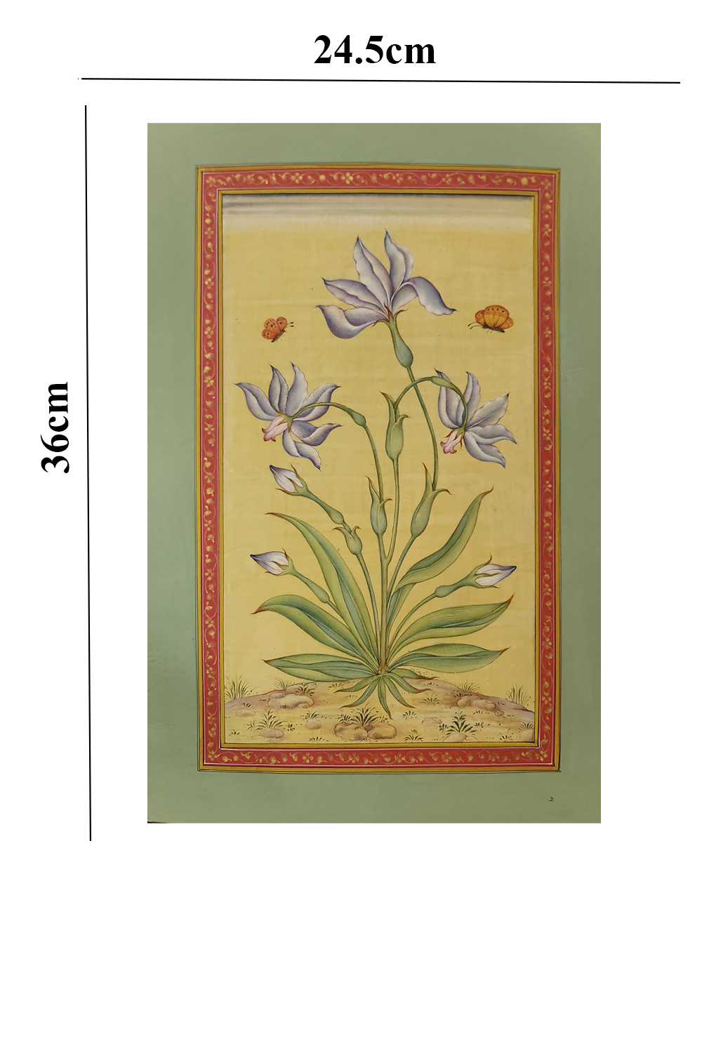 This exquisite Mughal miniature painting is a testament to the elegance and intricacy of traditional Indian art. The composition centers around a graceful flowering plant, its blossoms rendered in rich hues that contrast beautifully against the soft golden background. Two delicate butterflies hover around the flowers, symbolizing harmony and the fleeting beauty of nature. The artwork is framed by an opulent red border adorned with fine gold floral patterns and an outer green border, enhancing its regal appeal. Every brushstroke reflects the precision and mastery of miniature painting, making this piece an ideal addition to art collections or sophisticated decor. Please note that the frame is for visual representation only and is not included in the purchase price.