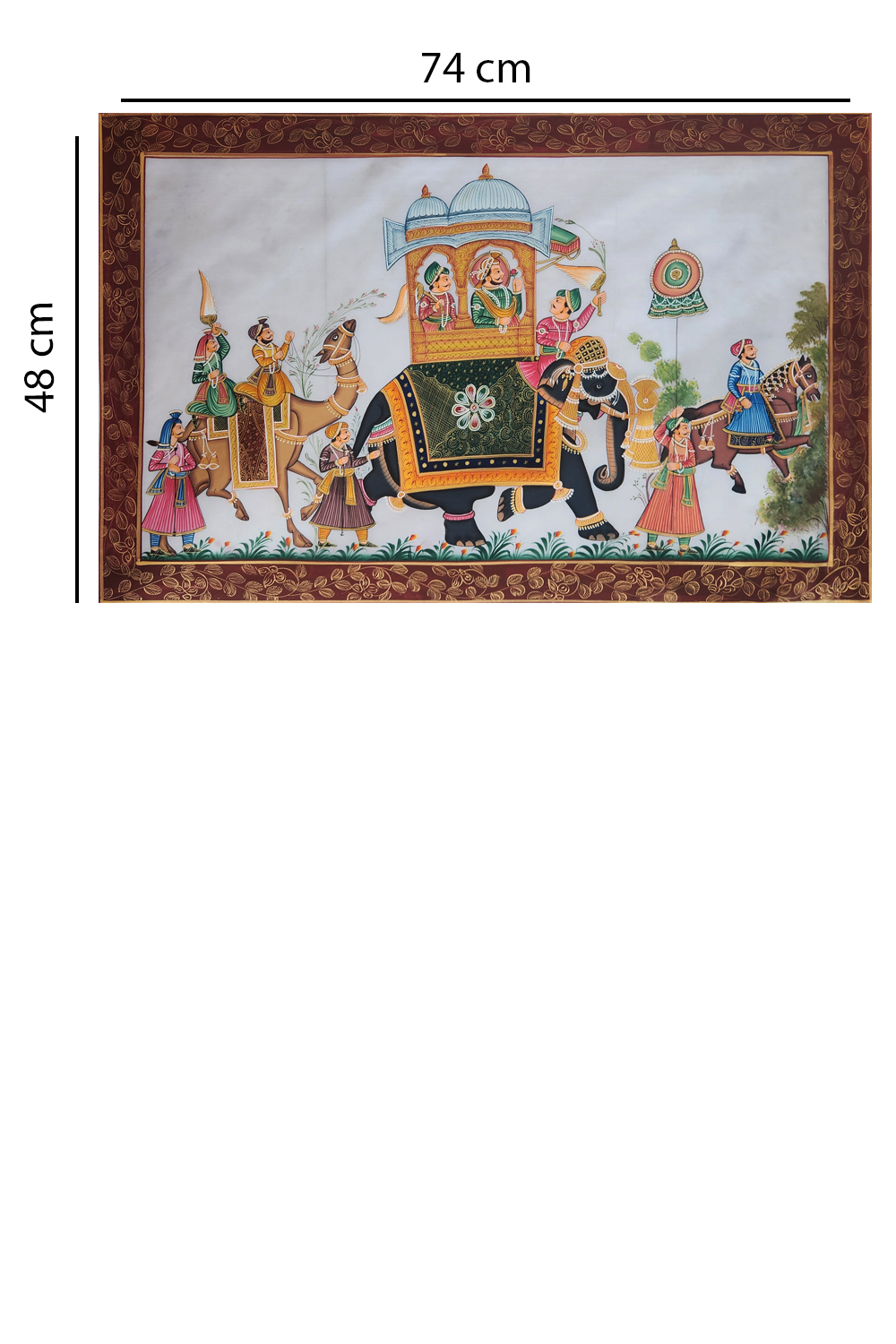 Echoes of the Maharaja is a meticulously hand-painted silk artwork that immortalizes the grandeur of a regal parade. At its heart is a richly adorned elephant carrying a royal couple in a lavishly decorated howdah, accompanied by an entourage of musicians, guards, and attendants—each rendered with precision and poise. Painted using original mineral colors, every figure is animated with depth, vibrancy, and heritage. Ornate borders and symbolic motifs frame the narrative, enhancing its opulence. This painting is more than decoration—it is a cultural chronicle, a tribute to India’s artistic traditions and ceremonial glory, perfect for connoisseurs who cherish timeless elegance and storytelling through art.