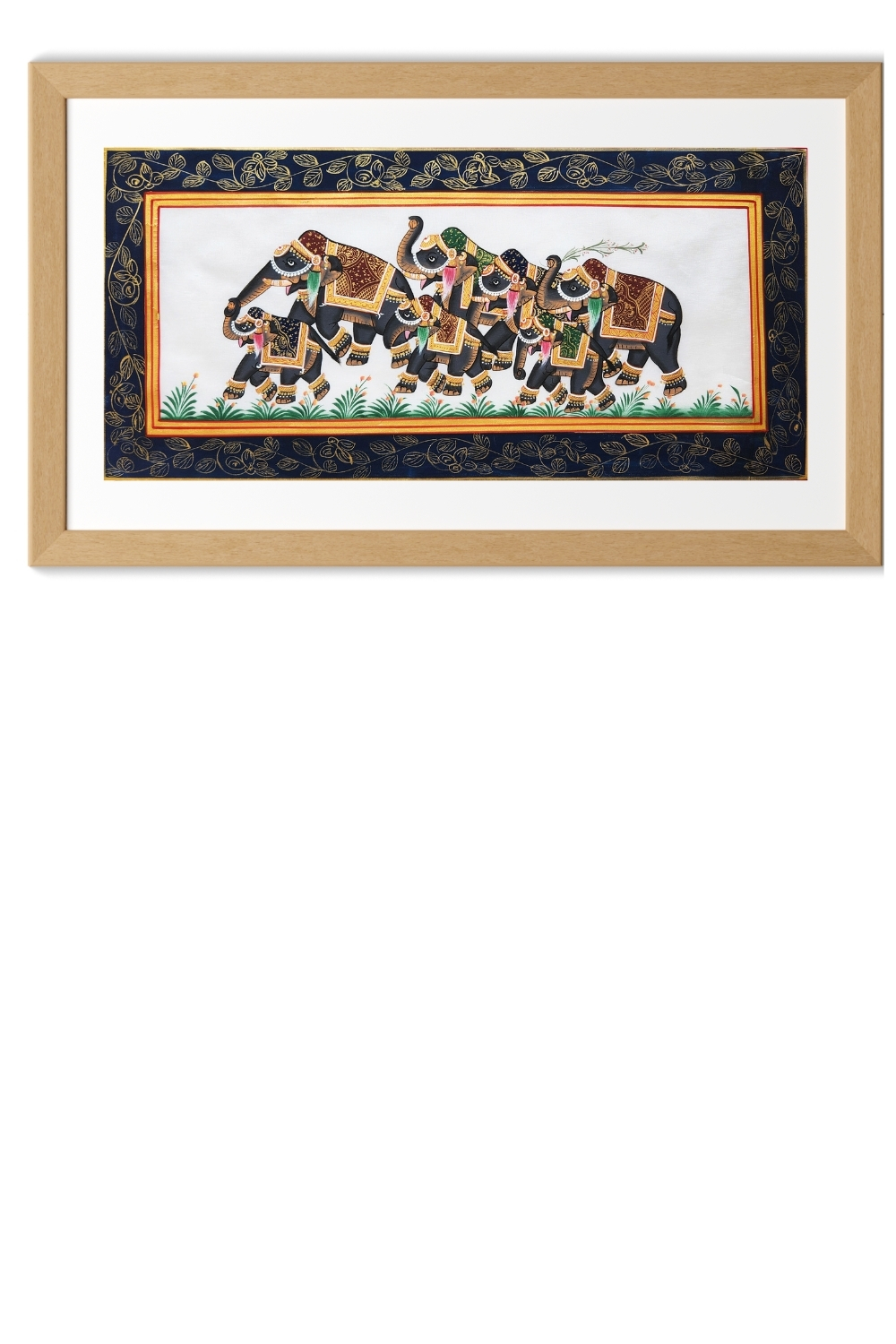 Royal Harmonies brings to life a ceremonial procession of elephants, rendered with majestic rhythm and cultural finesse on a smooth silk canvas. Each elephant, bedecked in elaborate coverings and regal finery, marches with quiet dignity, while the riders—dressed in traditional attire—evoke tales of royal grandeur. The painting’s vibrant composition is framed by an intricate blue floral border enriched with golden accents, further enhancing its royal charm. Painted entirely with original mineral colors, this piece carries a legacy of craftsmanship, where each brushstroke is steeped in cultural memory. Compact yet powerful in narrative, this artwork is perfect for collectors seeking authentic heritage and timeless beauty in a slim format.
