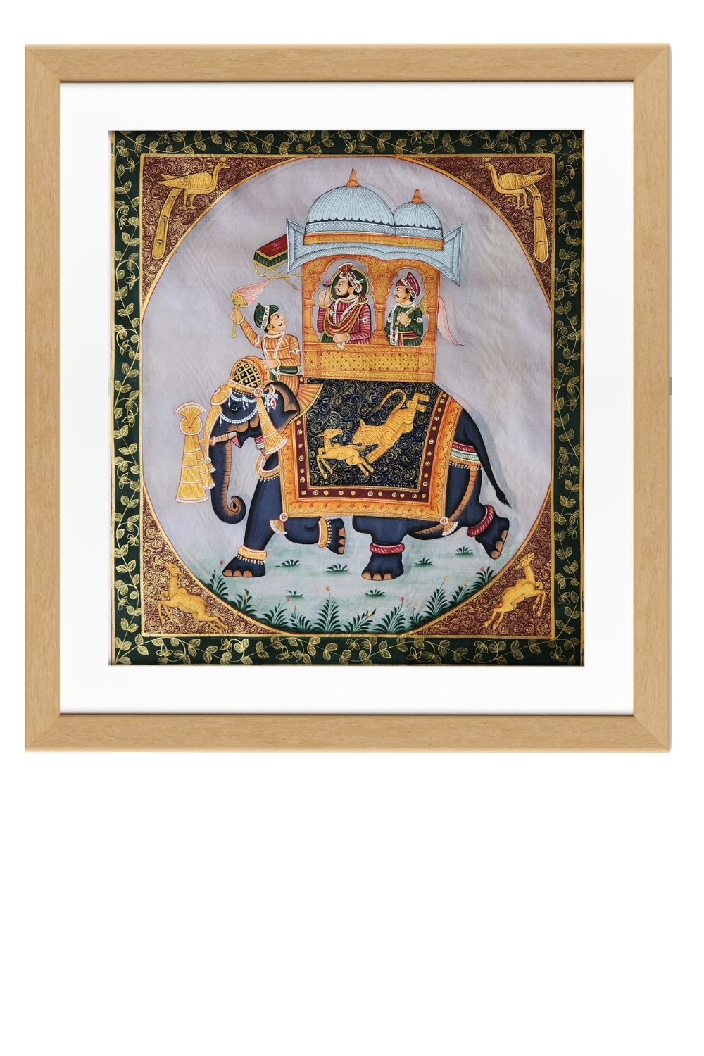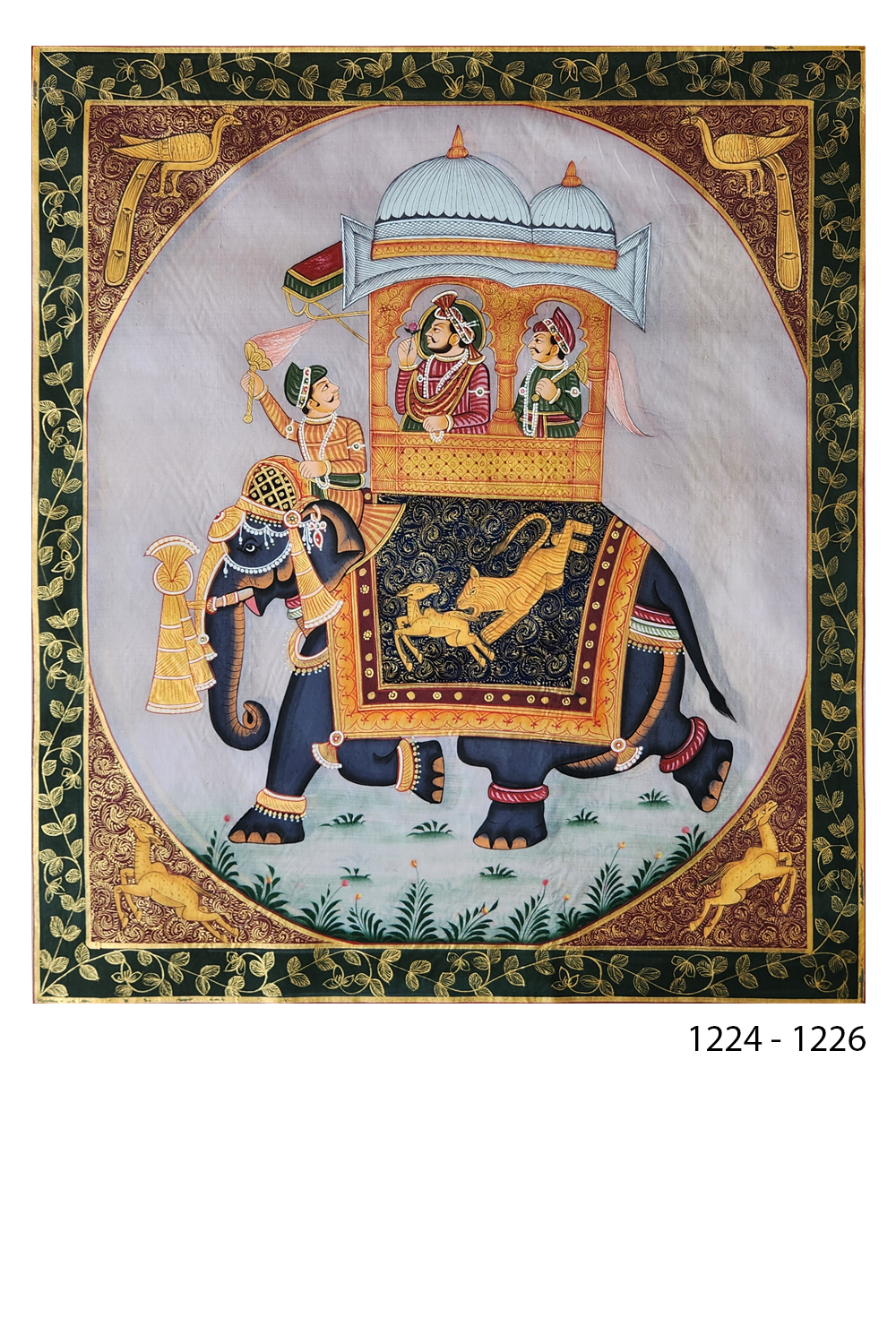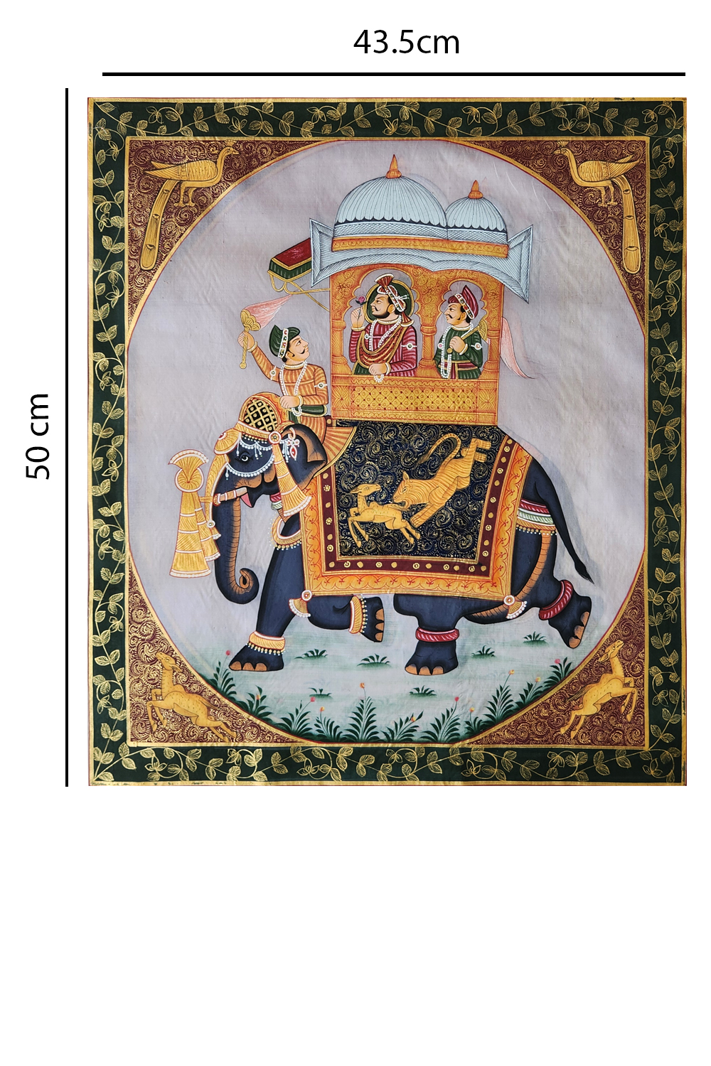 Palace Parade captures the grandeur of a royal entourage in full ceremonial splendor, featuring a magnificent elephant at the center—adorned with ornate textiles, golden harnesses, and a stately howdah carrying noble figures. Accompanied by dignified attendants and musicians, the entire scene unfolds with rhythm and reverence across the fine silk canvas. Each character is painted in striking detail, reflecting the traditions of classical miniature artistry. The original mineral pigments imbue the painting with vibrant yet earthy hues, giving it depth and historical resonance. This artwork pays homage to India’s regal heritage and transforms interiors into storytelling spaces filled with timeless elegance.