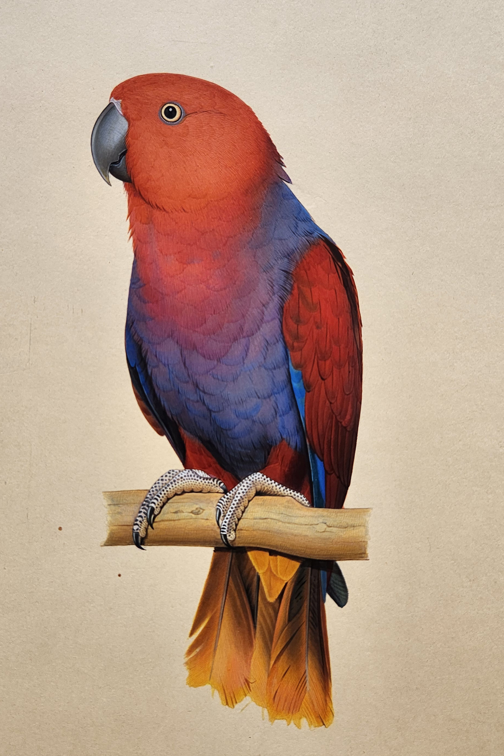 Product Content: The 'Red Horizon Parrot Miniature Painting' captures the vibrant beauty of a red parrot with subtle blue tones, creating a captivating and colorful scene. This miniature artwork, meticulously detailed, brings nature's elegance into your space, offering a perfect accent for bird lovers and art enthusiasts alike.