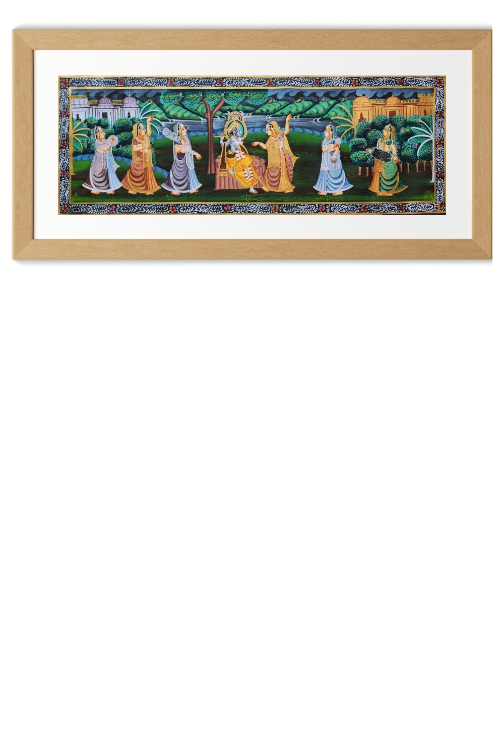 Procession of Valor celebrates the grandeur of India’s royal traditions through a singular, dignified elephant rendered in vertical composition. Adorned in embroidered textiles, gleaming headpieces, and ceremonial ornaments, the elephant stands with poise and power, capturing the essence of regal grace. The artwork, executed on fine silk with original mineral pigments, reveals extraordinary depth and luminosity, infusing each motif and brushstroke with warmth and reverence. Framed visually by an elegant border featuring floral and geometric patterns, the painting evokes movement, ritual, and symbolism. Designed for vertical spaces, this piece becomes a refined window into India’s artistic legacy.