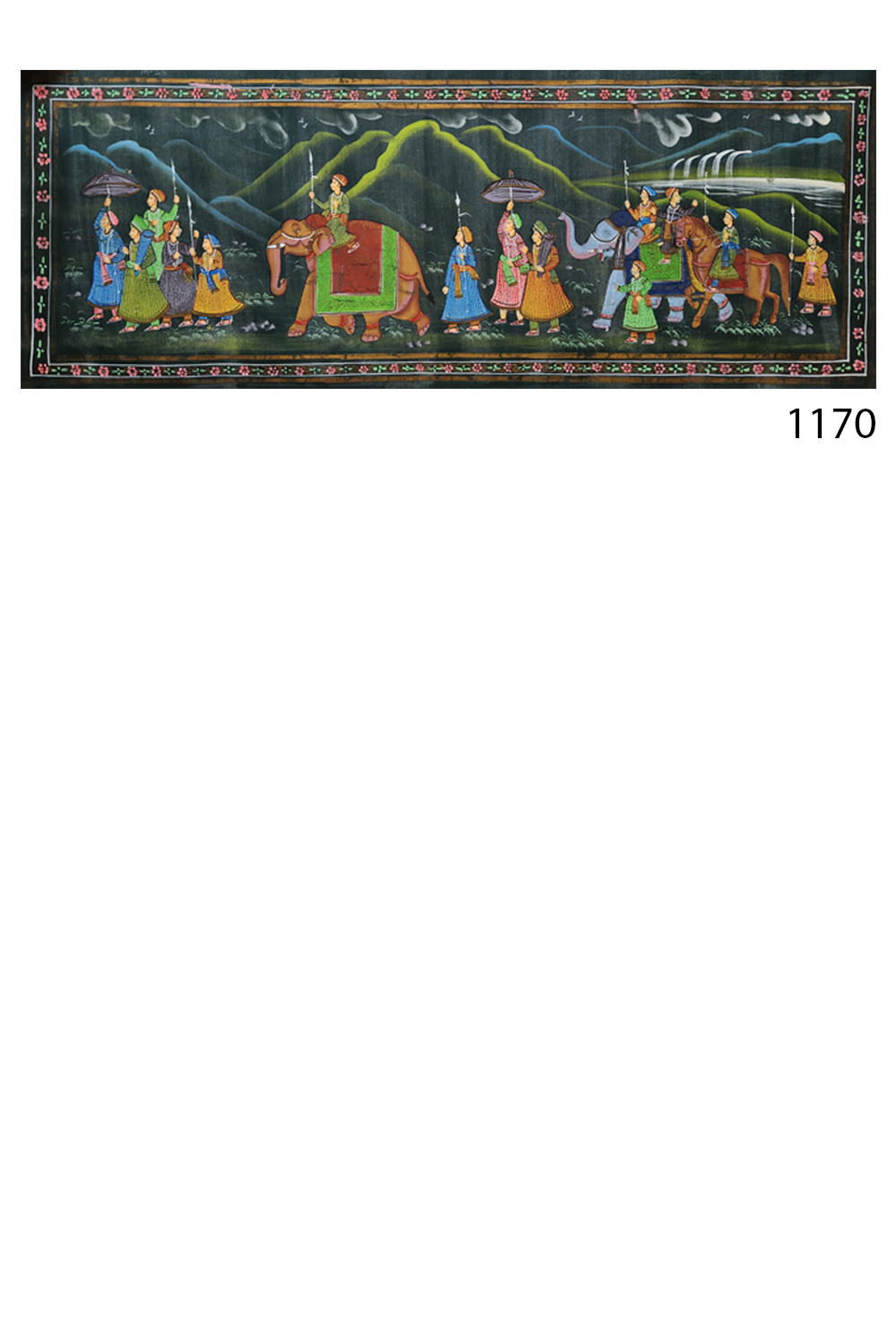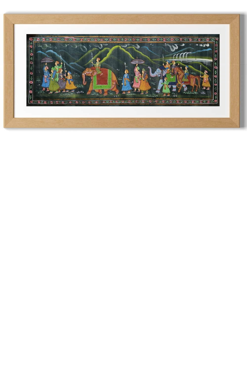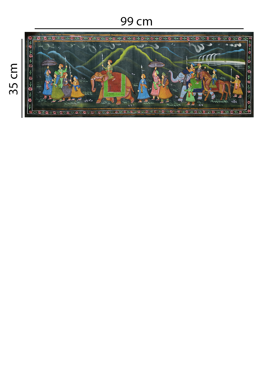 Rhythm of the Raj is an expansive silk composition that captures the grace and discipline of a traditional royal parade. Adorned elephants march in perfect alignment, each rendered with rich ceremonial coverings, ornamental gold work, and expressive poise. Painted with original mineral colors, the scene exudes depth, heritage, and harmony across its wide format. From the rhythmic spacing of the figures to the delicate floral border, every element narrates a tale of nobility and pageantry rooted in India’s classical miniature style. This artwork serves as both a visual legacy and an evocative accent piece for interiors steeped in culture and elegance.