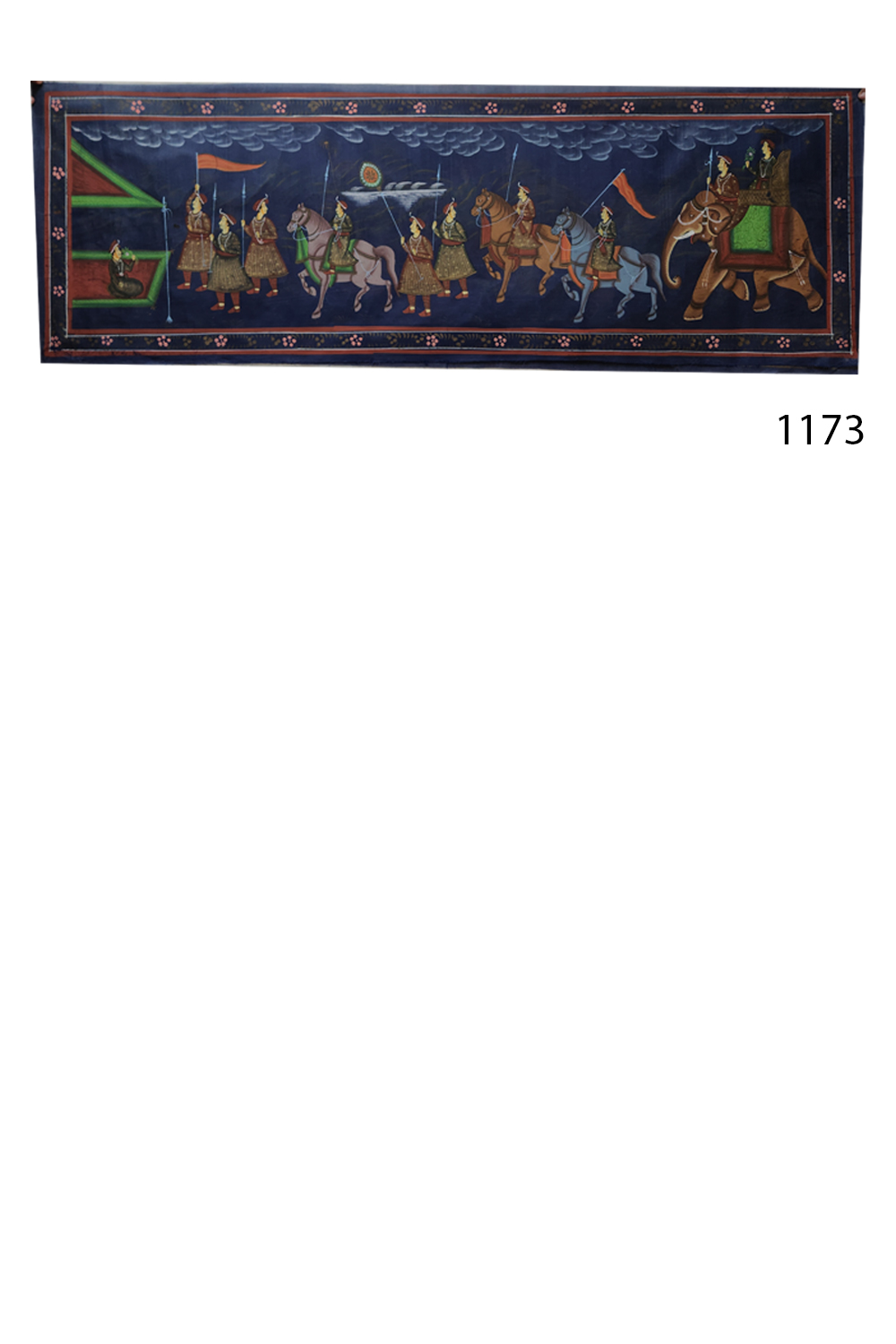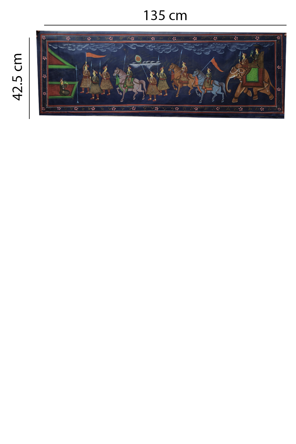 Processional Splendor is a grand silk composition that narrates a ceremonial march through art. Spanning across its elongated canvas, the painting features a series of regal elephants in perfect formation, each adorned with intricately patterned textiles, golden ornamentation, and ceremonial detailing. Painted on fine silk with traditional miniature brushwork, the artwork exudes heritage and grace in every figure. The use of original mineral colors offers depth and lasting vibrancy, while the rhythmic alignment of the elephants celebrates discipline, nobility, and cultural elegance. Framed visually with a classic border, this piece makes an ideal statement for collectors, traditional interiors, or curated gallery walls celebrating India's royal legacy.