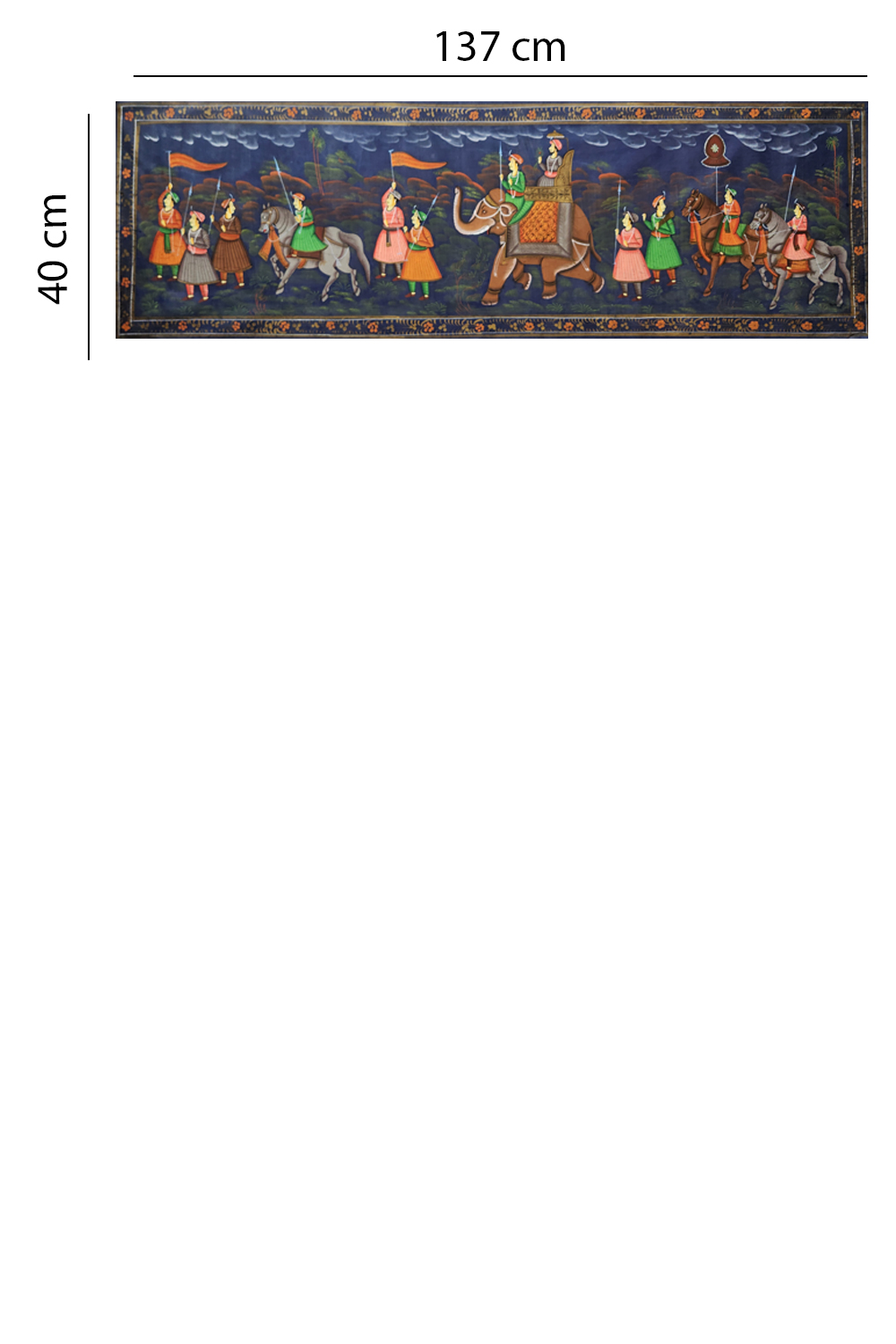 Procession of Legacy is an opulent silk tableau capturing the grandeur of royal ceremonial tradition. The composition presents a majestic scene where a central noble figure—seated atop a richly adorned elephant—is escorted by horse-mounted warriors and regal attendants bearing flags, spears, and musical instruments. Every figure is painted with miniature-style precision, featuring ornate garments, expressive postures, and storytelling symbolism. The deep blue background creates a vibrant contrast, allowing the procession’s intricate detailing to resonate. Crafted on premium silk and brought to life with authentic mineral pigments, this painting honors India’s heritage of pageantry and royal elegance. It’s a perfect piece for interiors that celebrate cultural identity and historical art.