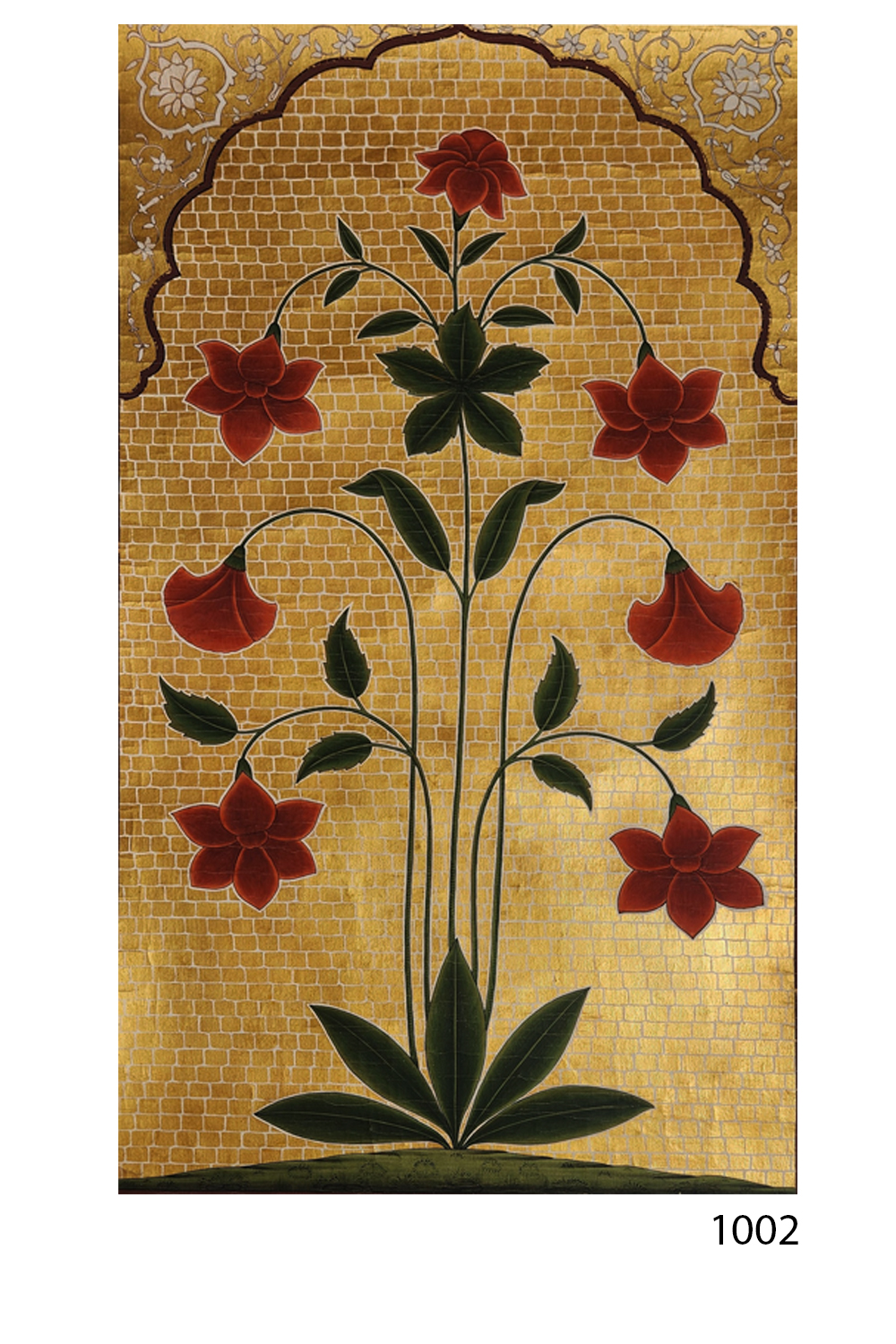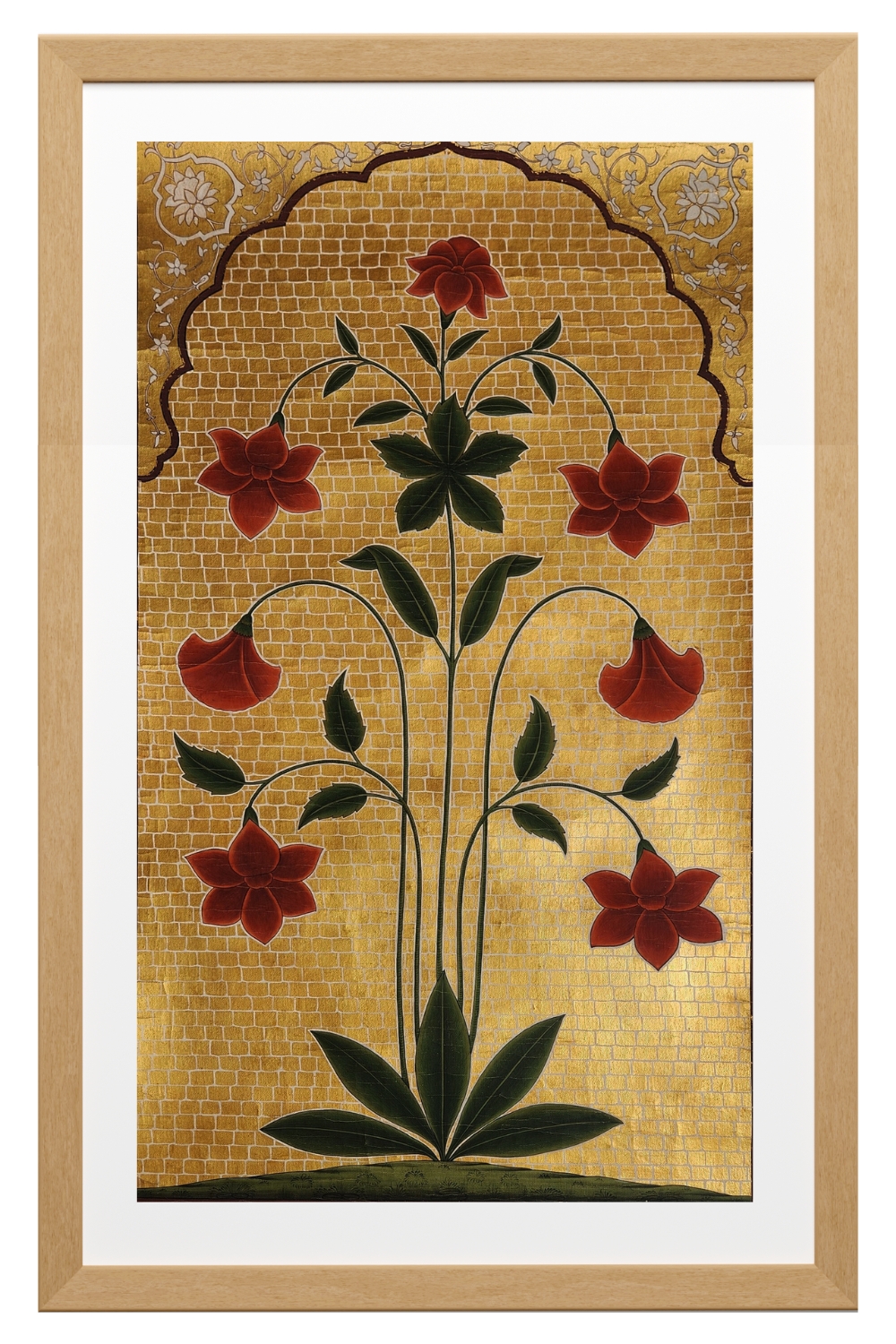 “Guldaan-e-Zar” is a celebration of floral symmetry and regal ornamentation. This hand-painted panel captures a stylized bouquet of red flowers blooming from a lush green base, each petal and leaf meticulously rendered in original mineral colors. The composition is framed by a golden backdrop reminiscent of antique brickwork or mosaic tiles, lending the piece a sense of architectural grandeur. An arch-like motif crowns the top, evoking the elegance of Mughal niches and temple frescoes. The artwork invites viewers into a space where nature meets geometry, and tradition meets timeless beauty. It is ideal for interiors that seek cultural depth, botanical rhythm, and a touch of opulence.
