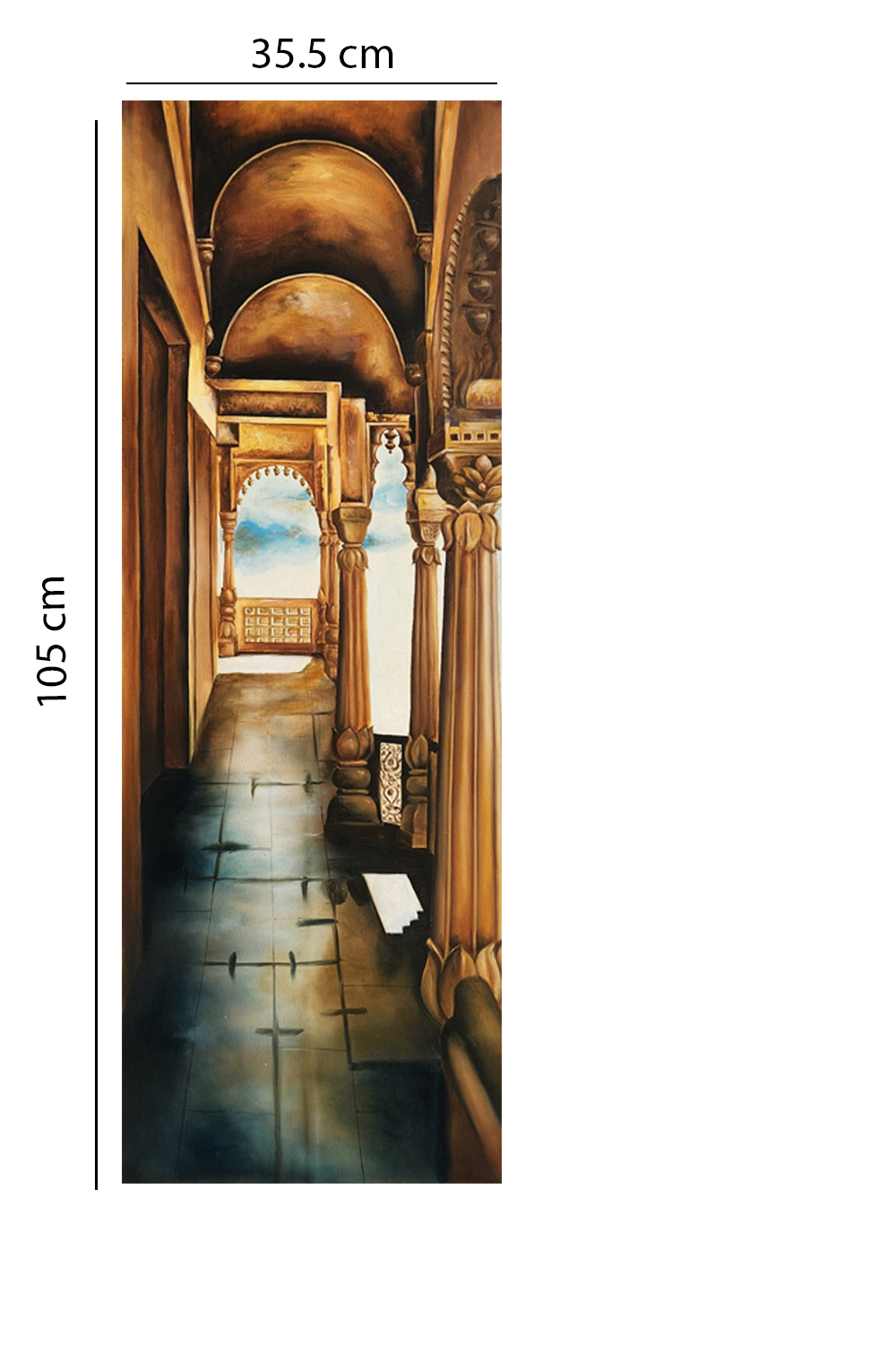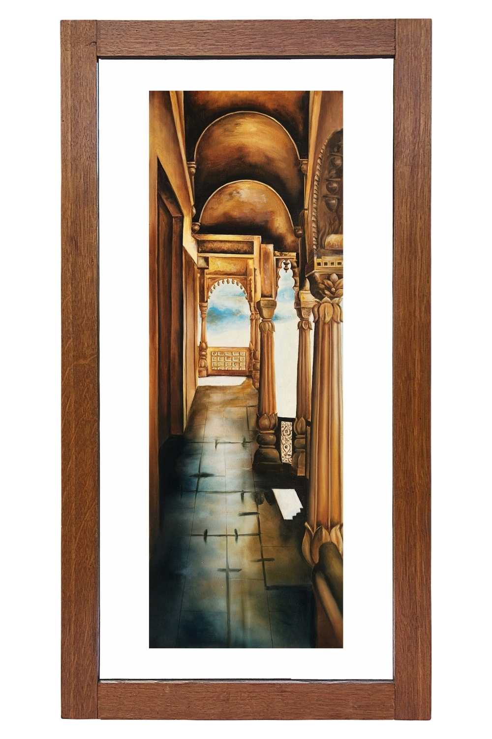 “Sheesh Mahal Ki Jhalak” captures the poetic transition from shadow to light, guiding the viewer through a richly detailed corridor of arches and columns that culminates in a bright, open balcony. The architectural elements—ornate carvings, rhythmic pillars, and vaulted arches—are inspired by classical Indian and Middle Eastern design traditions. The perspective draws the eye forward, creating a sense of depth and movement, while the distant blue sky and landscape offer a moment of visual release and serenity. Painted using original mineral pigments, this oil panel carries the tactile richness and chromatic permanence of heritage techniques. The warm palette of browns, golds, and sunlit blues evokes both grandeur and calm, making this piece ideal for interiors that celebrate cultural storytelling and spatial elegance.