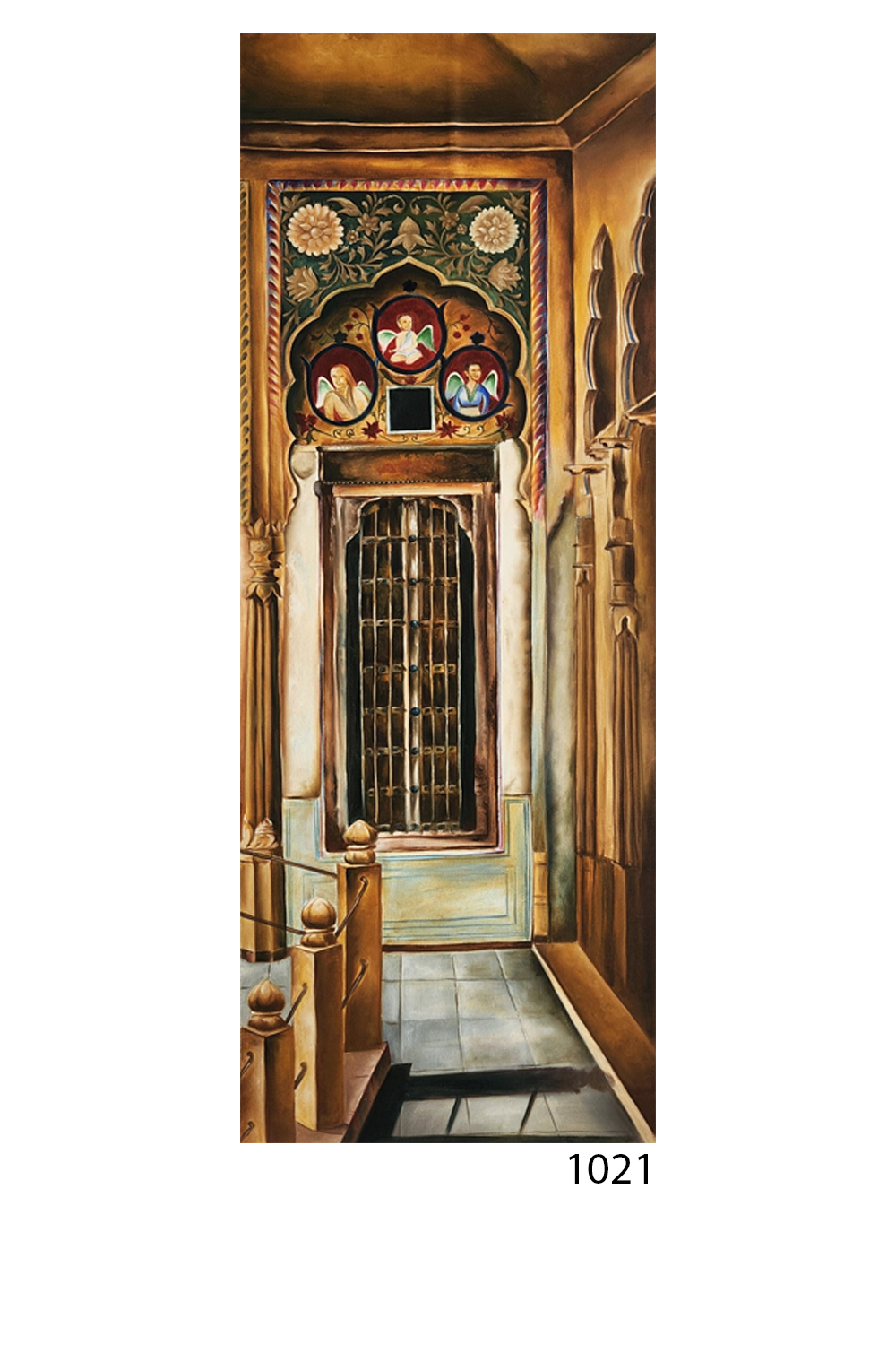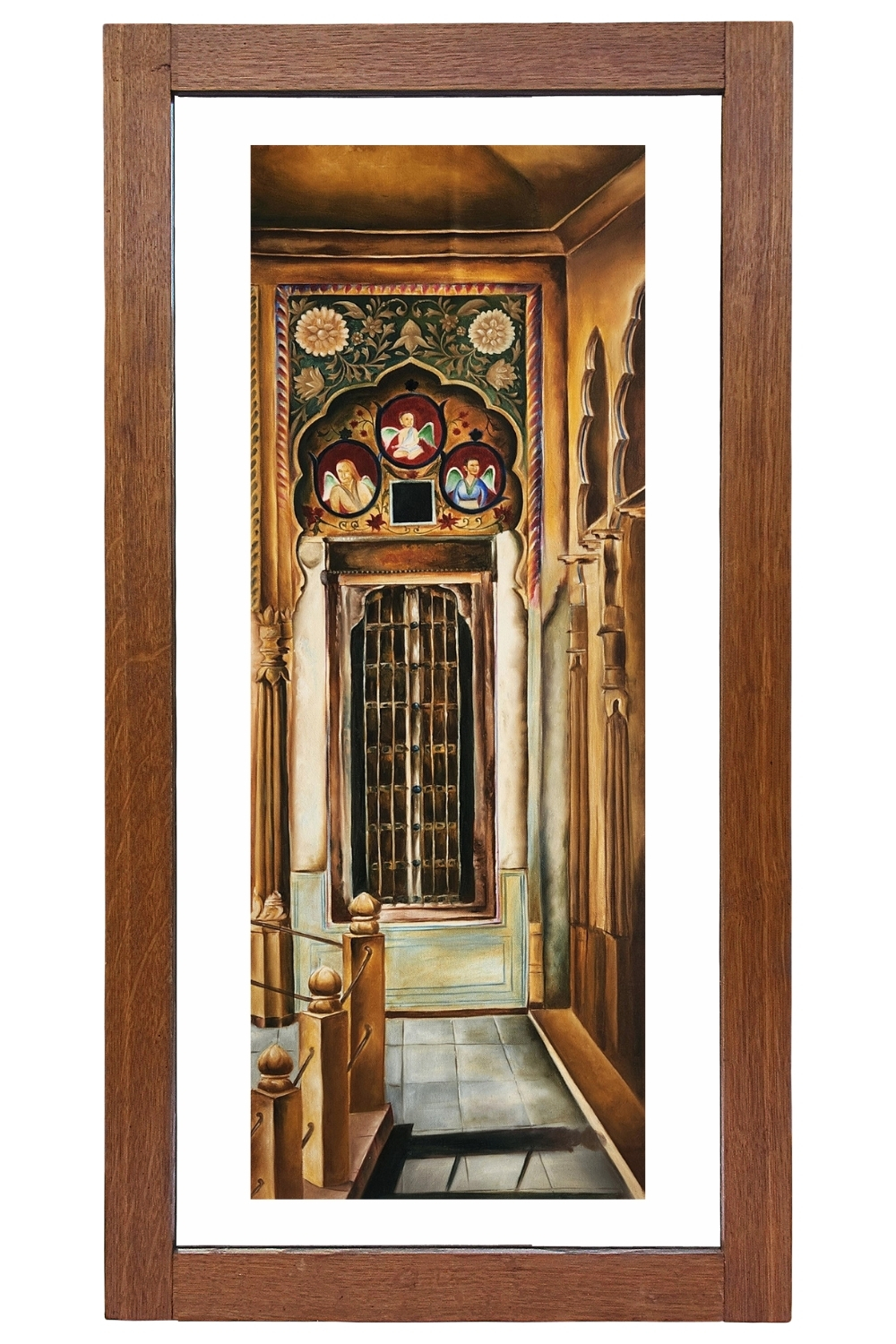 “Darwazon Ka Saawan” is a celebration of architectural ornamentation and cultural memory, capturing the façade of a heritage interior with exquisite precision. The painting features a richly decorated wall adorned with floral and geometric carvings, crowned by three arched niches that house painted portraits—each framed in delicate motifs that echo miniature traditions. Below the niches, a latticed window flanked by carved columns anchors the composition, while the tiled floor and perspective lines draw the viewer into the depth of the space. The warm palette of terracotta, ochre, and muted greens evokes the ambiance of royal havelis and temple interiors. Hand-painted using original mineral pigments, this oil panel carries the tactile richness and chromatic permanence of traditional techniques. It’s a piece that speaks to heritage, craftsmanship, and the poetry of built spaces—ideal for interiors that honor cultural storytelling and architectural beauty.