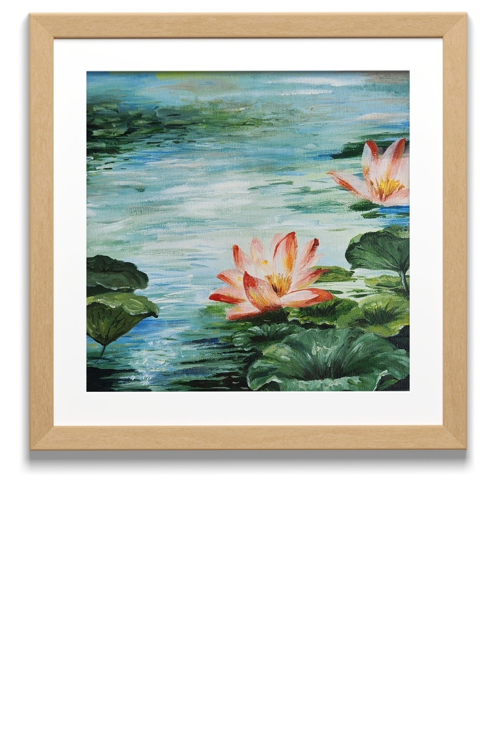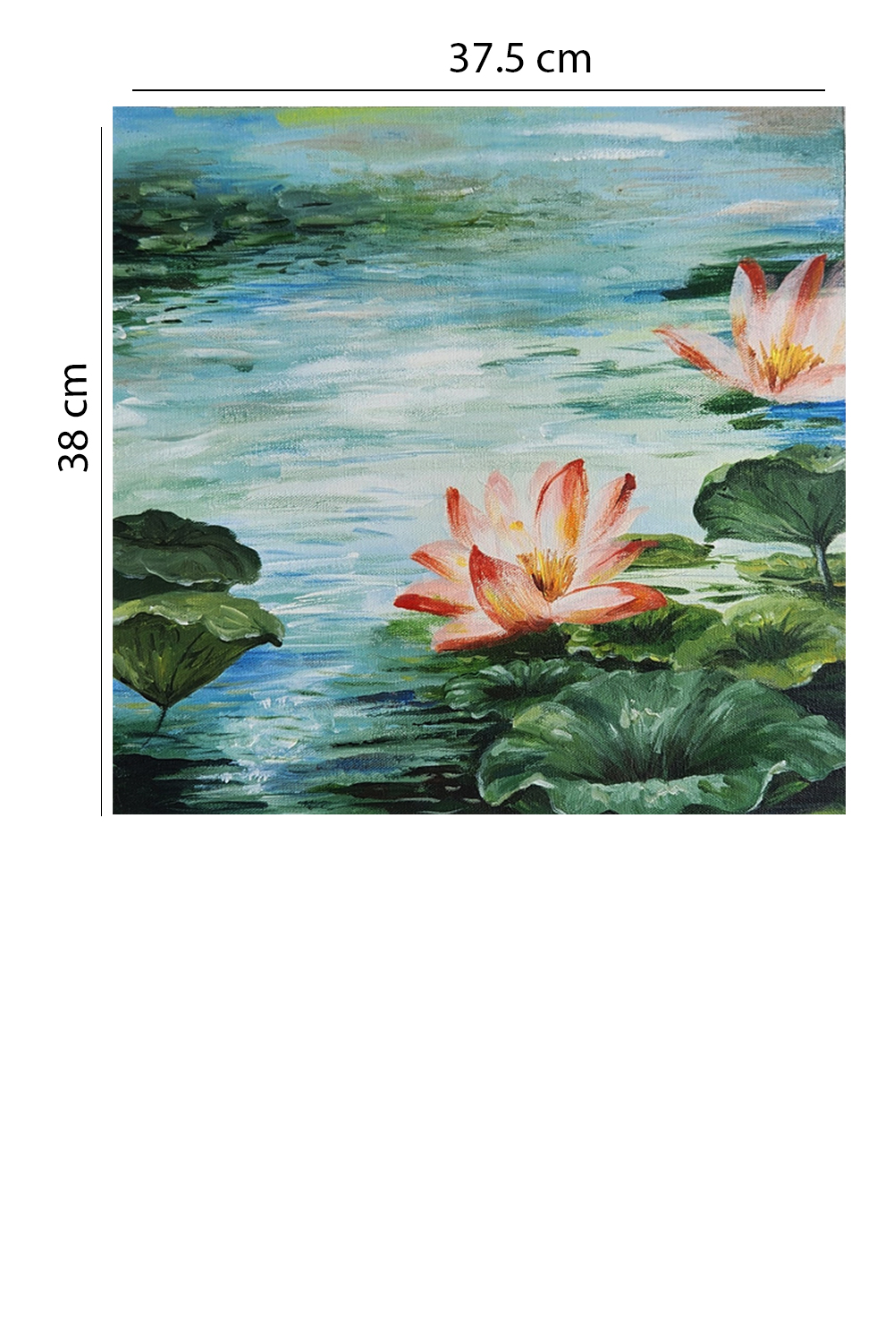 - Depicts two blooming water lilies surrounded by lily pads on a tranquil pond