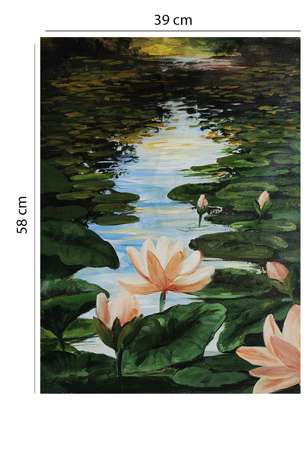 “Lotus Reverie at Dusk” is a serene silk painting that evokes the quiet poetry of nature. Rendered with original mineral pigments on fine silk, this piece portrays a meditative water scene where lotus blossoms unfurl gently among lush lily pads. The sky transitions from golden yellow to deep twilight hues, reflecting softly in the water and lending the composition a sense of depth and stillness. Each lotus is painted in varying stages of bloom, symbolizing renewal and grace. The artist’s brushwork balances delicate detailing with fluid abstraction, making this piece ideal for interiors that seek cultural richness and emotional calm. Rooted in Indian miniature traditions yet expansive in its visual rhythm, this painting invites contemplation and connection.