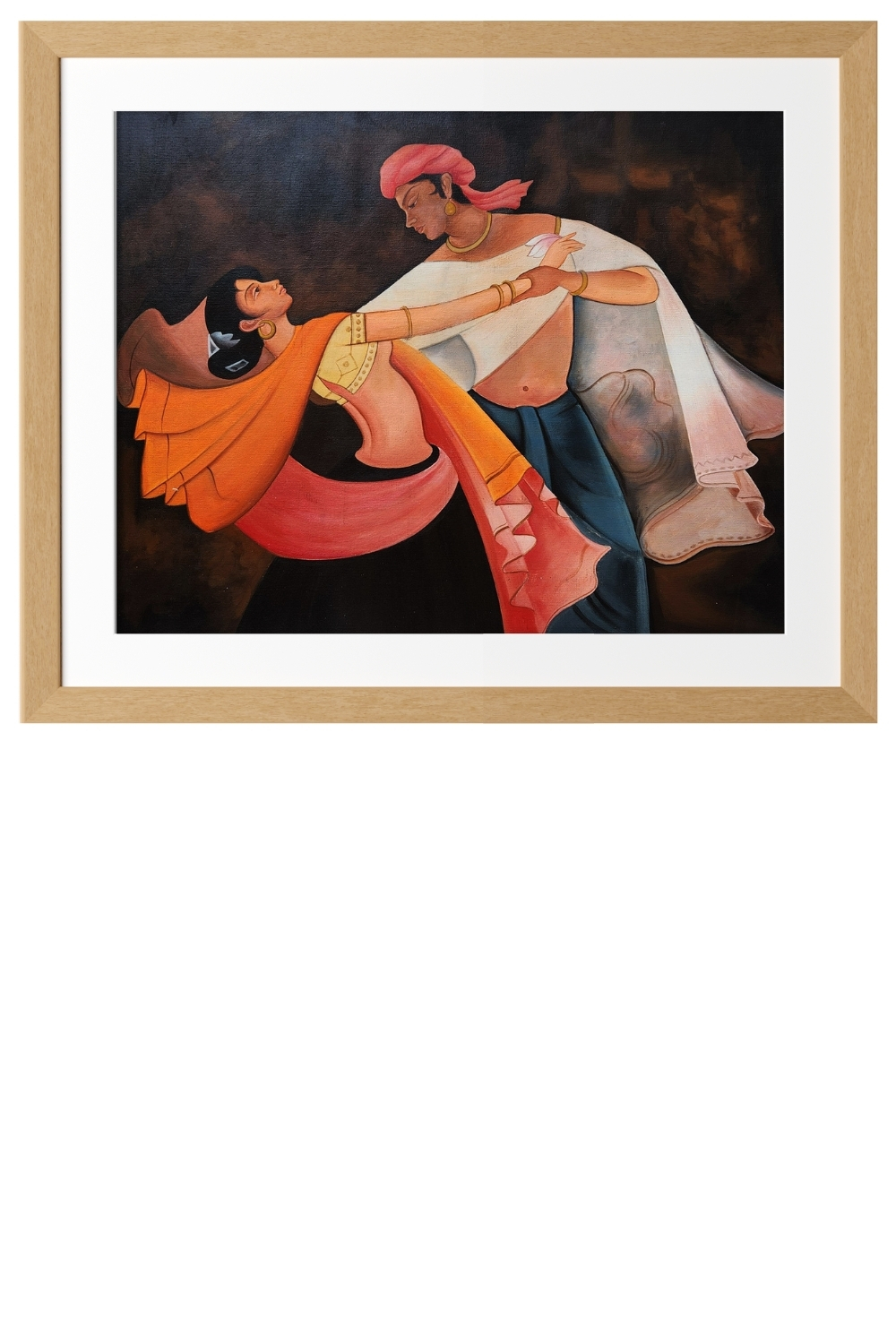 “Rhythm of Grace” is a striking silk painting that celebrates movement, tradition, and emotional connection through the lens of classical Indian dance. Painted with original mineral pigments on fine silk, the composition features two dancers mid-performance—one in vibrant orange and pink, the other in serene white and blue—locked in a fluid exchange of gesture and gaze. Their attire, jewelry, and expressive postures evoke the grandeur of Indian heritage, while the dark background enhances the vividness of their forms and the intimacy of the moment. The artist’s brushwork is both stylized and emotive, capturing the rhythm and elegance of the dance with poetic precision. This artwork is ideal for collectors, cultural spaces, or interiors that seek to honor India’s artistic legacy with sophistication and soul.