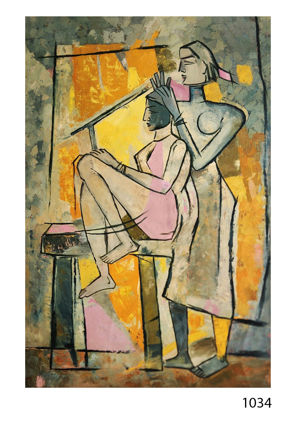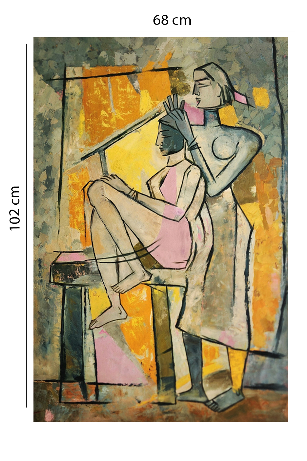 Saaj-Shringar captures a quiet, tender moment between two figures—one seated, the other gently styling their hair. The composition, rooted in cubist abstraction, transforms a personal ritual into a visual symphony of shapes, shadows, and emotion. The figures are constructed through angular forms and expressive outlines, while the palette—soft pinks, muted yellows, greys, and blacks—evokes warmth and introspection. Painted with original mineral pigments, the artwork carries a tactile depth and timeless quality. This piece invites viewers to reflect on themes of companionship, care, and everyday intimacy, making it a striking addition to both modern and heritage-inspired interiors.
