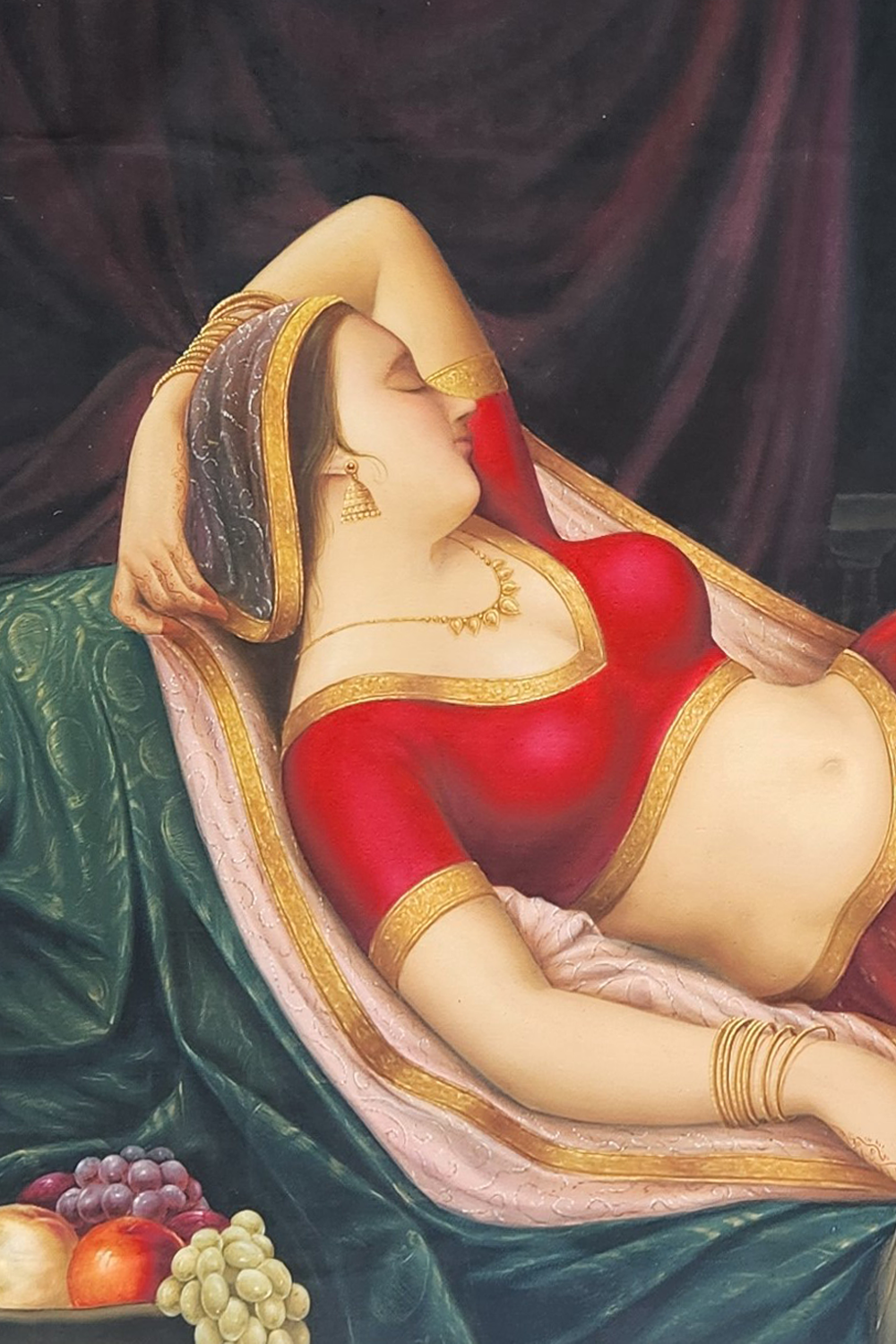 Vishraam captures a moment of serene elegance—a woman reclines gracefully on a plush divan, enveloped in the richness of traditional Indian textiles and jewelry. Her red sari, embellished with gold, flows around her like a tapestry of heritage, while her posture exudes quiet confidence and leisure. The dark, moody background hints at a luxurious interior, subtly framing her presence without distraction. A small arrangement of fruits near her adds a touch of domestic opulence. Painted with original mineral pigments, this oil artwork carries a timeless depth and tactile richness. It evokes themes of femininity, rest, and cultural pride, making it a striking centerpiece for interiors that celebrate Indian heritage and refined storytelling.
