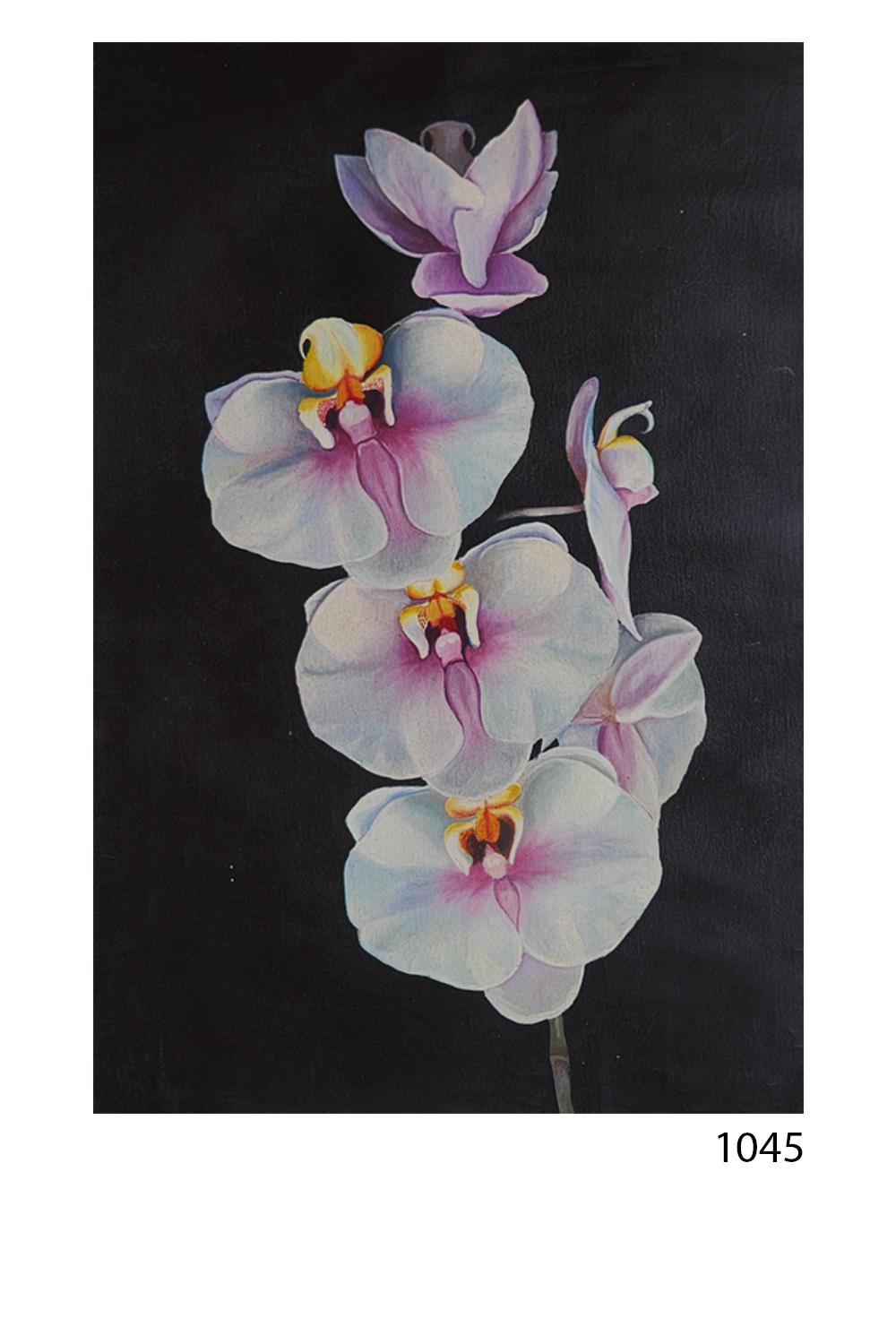 “Nargis Ki Chhaya” is a hand-painted canvas that celebrates the delicate beauty of orchids through a refined, heritage-inspired lens. Set against a deep black backdrop, the vertical arrangement of white orchids—tinged with soft pinks, purples, and golden centers—evokes both realism and poetic restraint. Each petal is rendered with precision, using original mineral colors that lend depth, texture, and timeless vibrancy. The composition invites stillness and contemplation, making it ideal for curated interiors, campaign visuals, or collectors seeking botanical elegance with cultural soul. This piece is a tribute to nature’s quiet grandeur, painted with emotional clarity and artisan finesse.