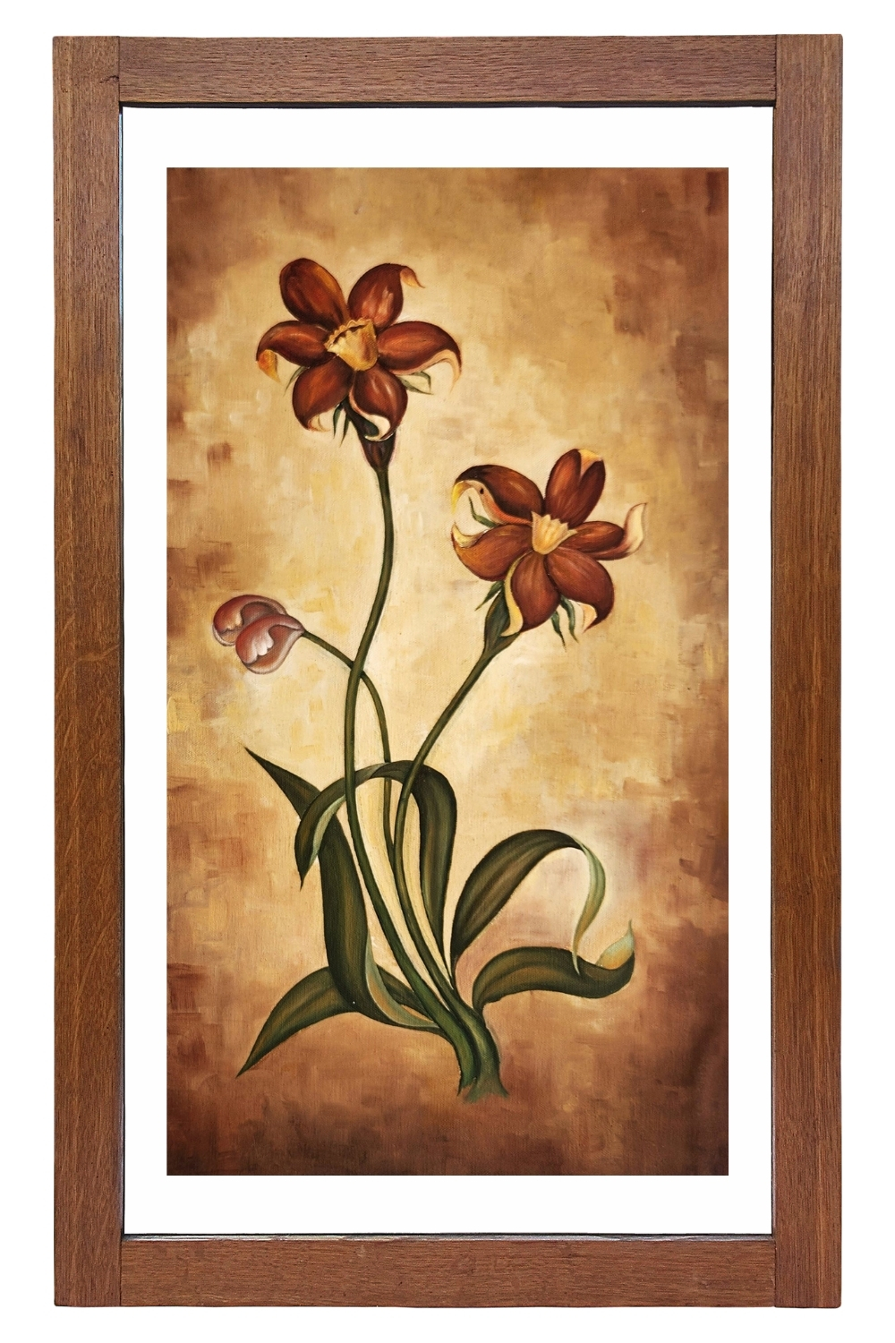 “Dharti Ke Rang” is a hand-painted canvas that celebrates the grounded beauty of flora through a warm, textured composition. Two stylized flowers with reddish-brown petals and golden centers sway gently on curved green stems, set against a gradient background of earthy beige and brown. The artwork evokes a sense of movement and quiet strength, painted entirely with original mineral colors that lend depth, richness, and timeless authenticity. Ideal for curated interiors, poetic campaign visuals, or collectors seeking tactile elegance, this piece reflects the harmony between nature’s simplicity and artistic precision.