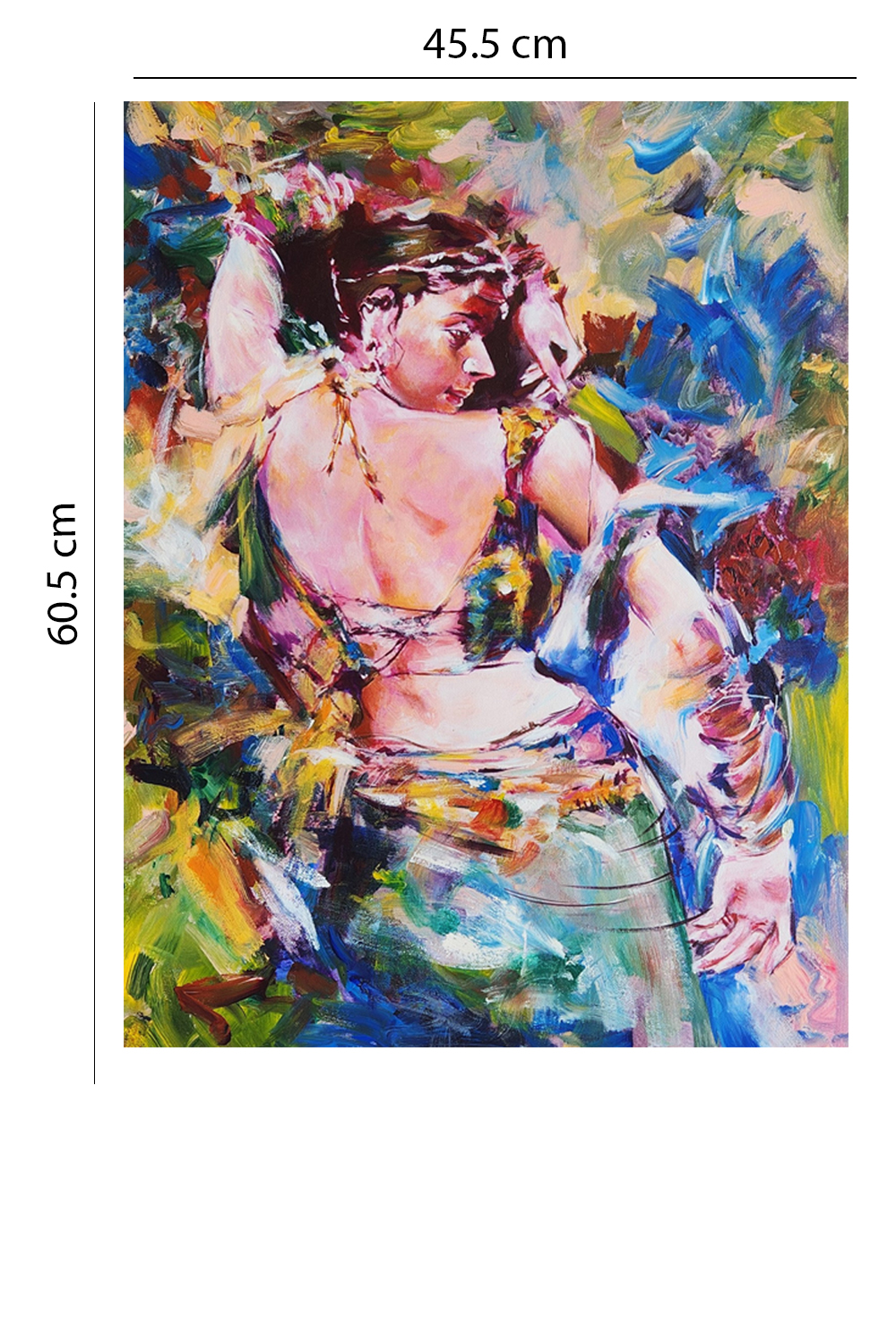 “Nritya Ki Leher” is a hand-painted canvas that captures the raw energy and grace of dance through bold brushwork and vivid hues. Depicted from behind, the dancer’s raised arms and turned torso suggest fluid movement, while her flowing costume adds rhythm and texture to the composition. The abstract background—alive with pinks, blues, greens, and yellows—echoes the emotional intensity of performance. Painted using original mineral colors, this piece carries the tactile richness and luminosity of traditional Indian artistry. Whether displayed in curated interiors or used in campaign storytelling, it evokes motion, celebration, and the expressive power of the human form.