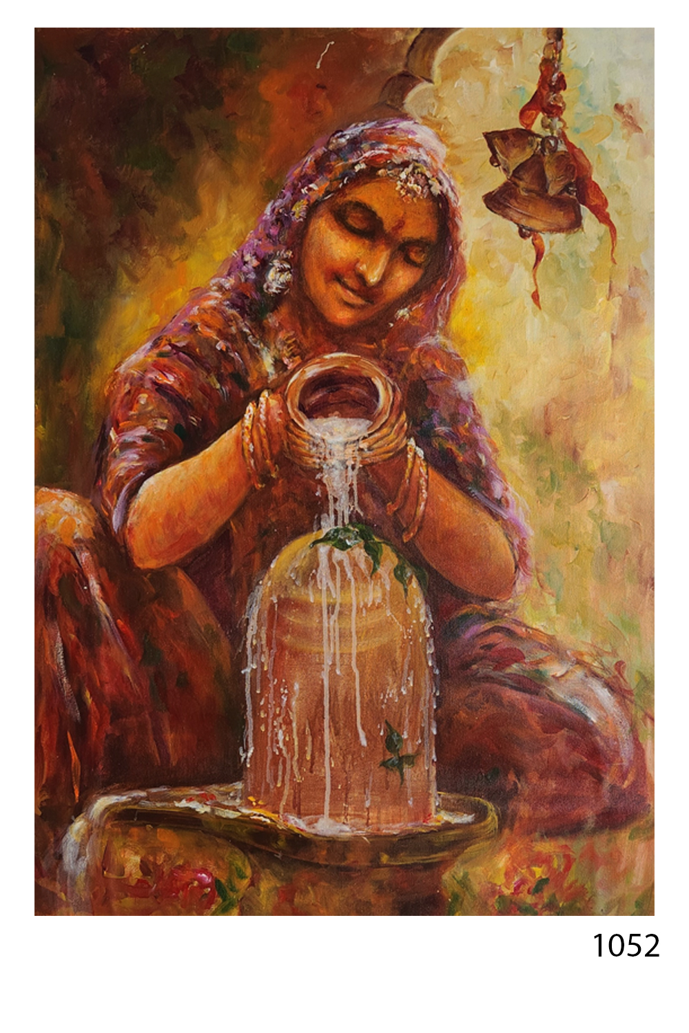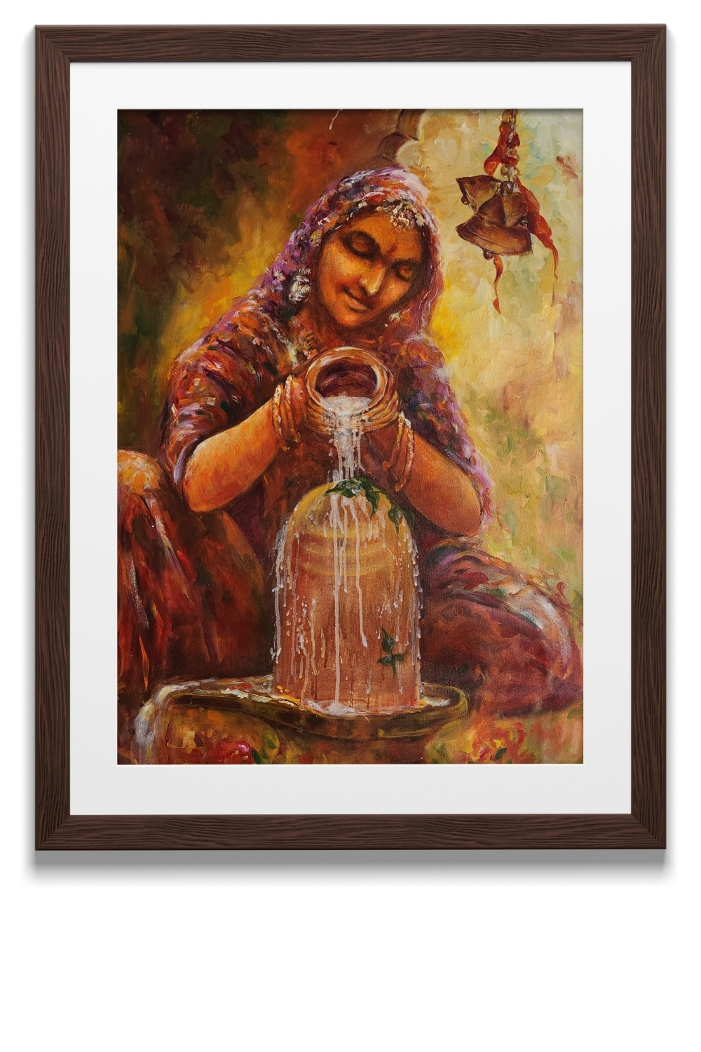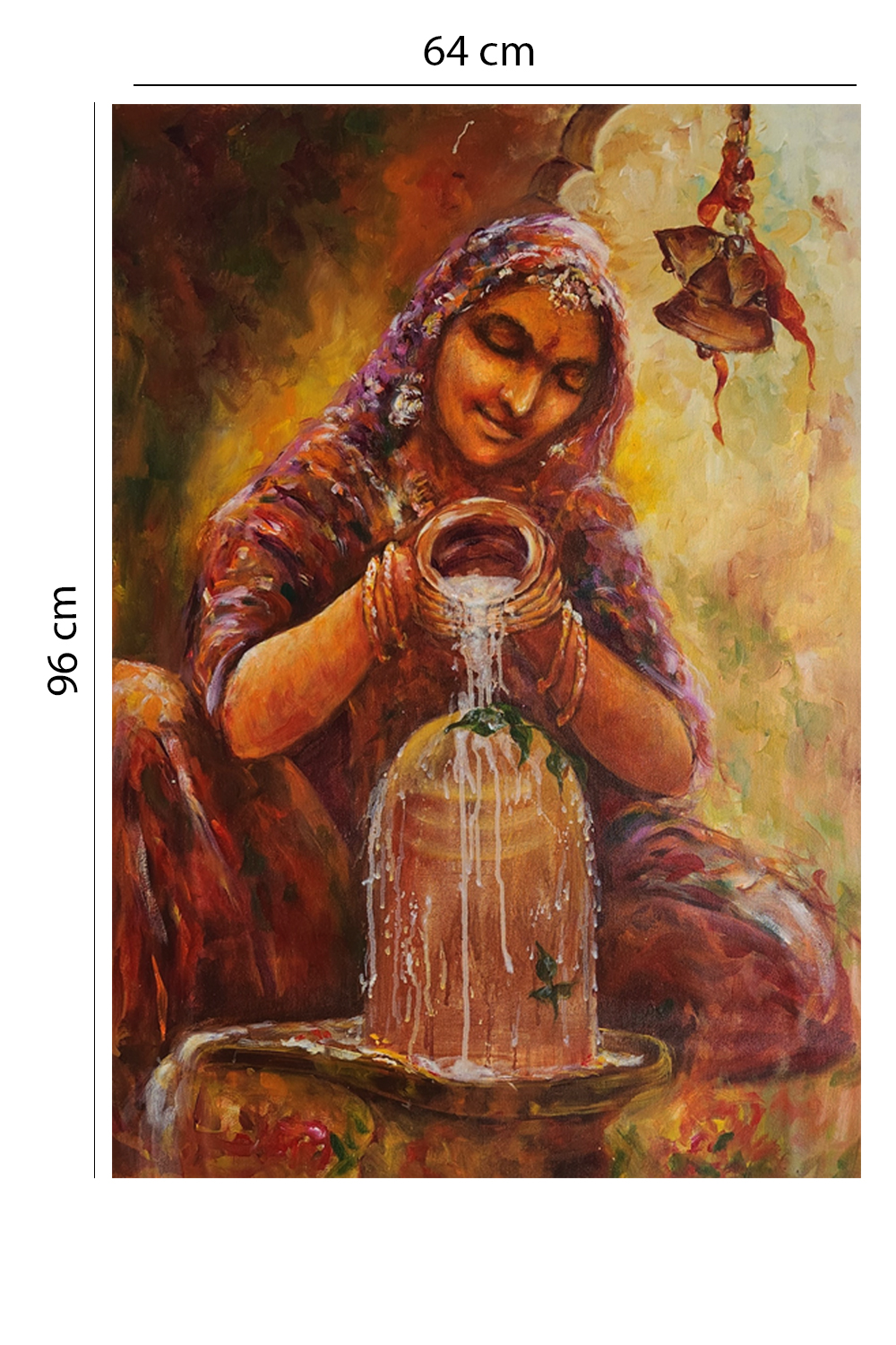 “Shiv Arpan” is a hand-painted canvas that honors the sacred act of offering—depicting a woman in traditional attire gently pouring water over a Shiva Lingam. Her serene expression and graceful posture evoke spiritual focus, while the clay pot, temple bell, and flowing water symbolize purity and ritual. The warm, earthy background enhances the meditative ambiance, grounding the scene in cultural authenticity. Painted using original mineral colors, this artwork carries the tactile richness and emotional depth of Indian devotional art. Ideal for spiritual interiors, heritage exhibitions, or campaign visuals rooted in tradition, it invites viewers into a moment of quiet surrender and sacred rhythm.