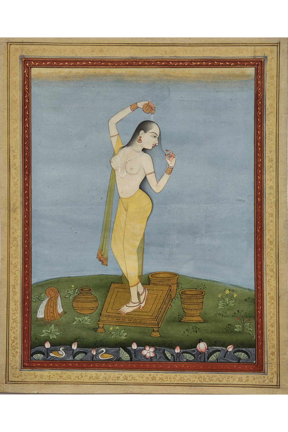 Step into the realm of subtle allure with the Silent Elegance Miniature Painting. This artwork, featuring a poised nude figure, showcases the beauty of simplicity through its delicate brushwork and minimalist style. Each stroke brings the figure to life, exuding grace and understated elegance. This handcrafted painting is perfect for enhancing intimate spaces like bedrooms or private collections, adding an air of sophistication and calm. The vertical orientation and compact size make it ideal for smaller walls or gallery setups, where it can command attention without overpowering the space.