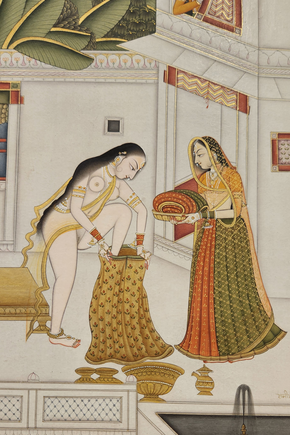Step into a moment of quiet allure with the Veiled Allure Miniature Painting, where the silent connection between two figures is portrayed with elegance and finesse. This handcrafted piece, with its delicate strokes and harmonious color palette, reflects the mystery and subtle emotions in the interaction between the man and woman. Its vertical orientation makes it perfect for adding depth and sophistication to narrow spaces, while the attention to detail ensures it will be a conversation starter in any room.