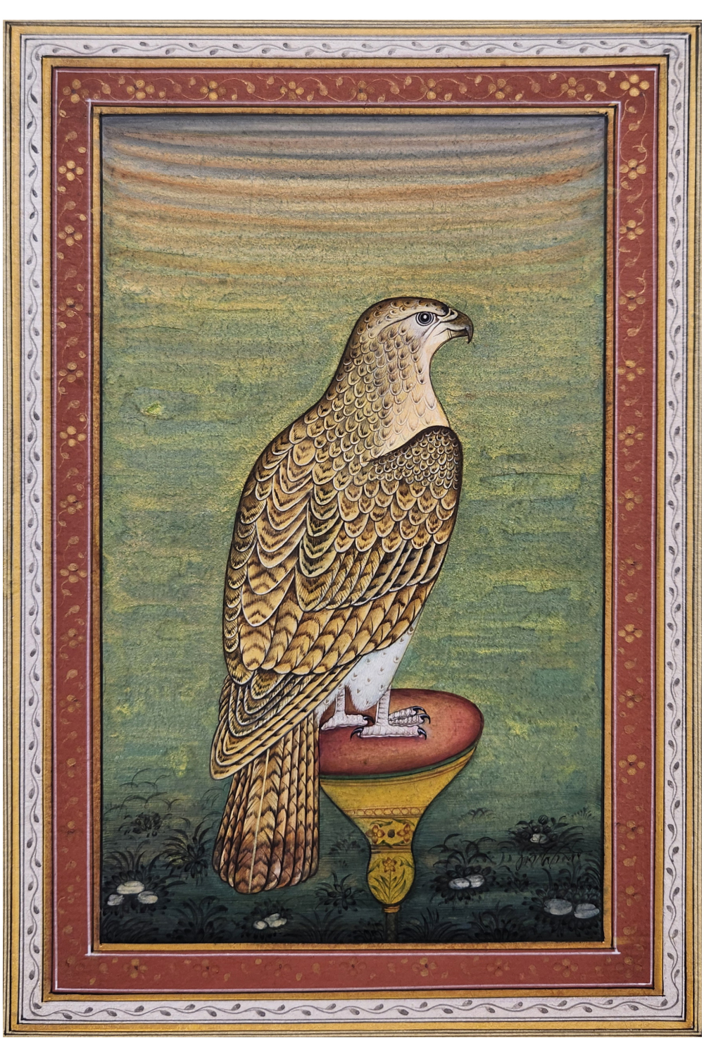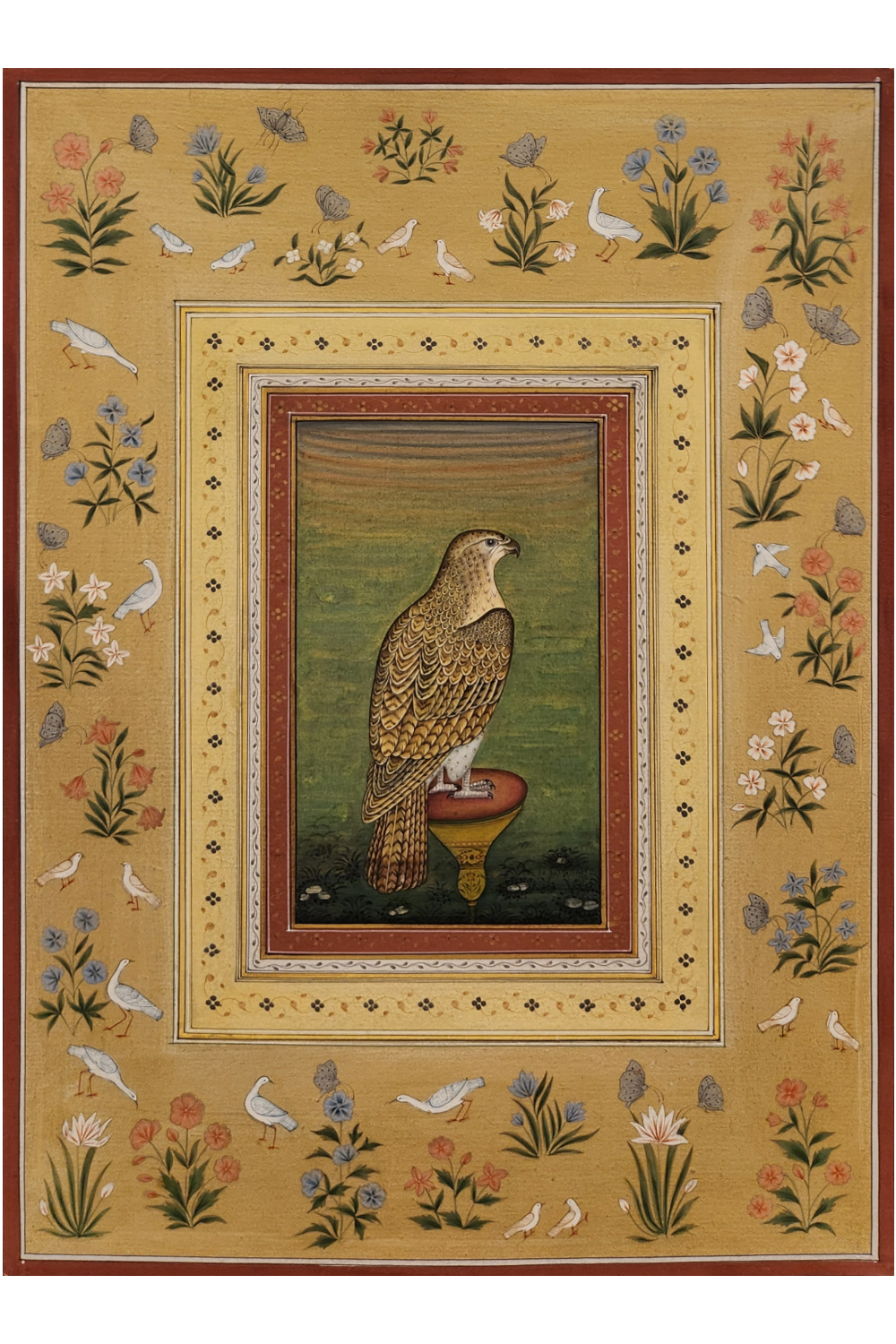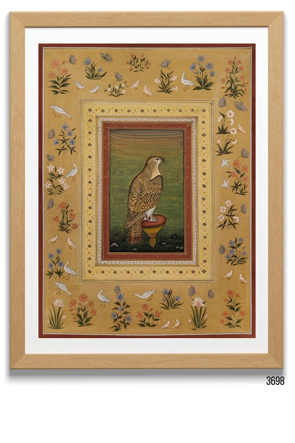 The Feathered Elegance Miniature Painting is a beautifully hand-painted piece that brings together the serene beauty of nature. Featuring a graceful bird surrounded by delicate flowers and framed by an intricate bird border, this artwork captures a timeless charm. Crafted with meticulous attention to detail on premium art paper, the painting is finished with a matte touch, enhancing its sophisticated appeal. Ideal for adding a refined, nature-inspired accent to any room, the painting's vertical orientation makes it perfect for narrow spaces. Its lightweight design ensures easy hanging and framing, although the frame is not included in the price and can be requested separately at an additional cost.